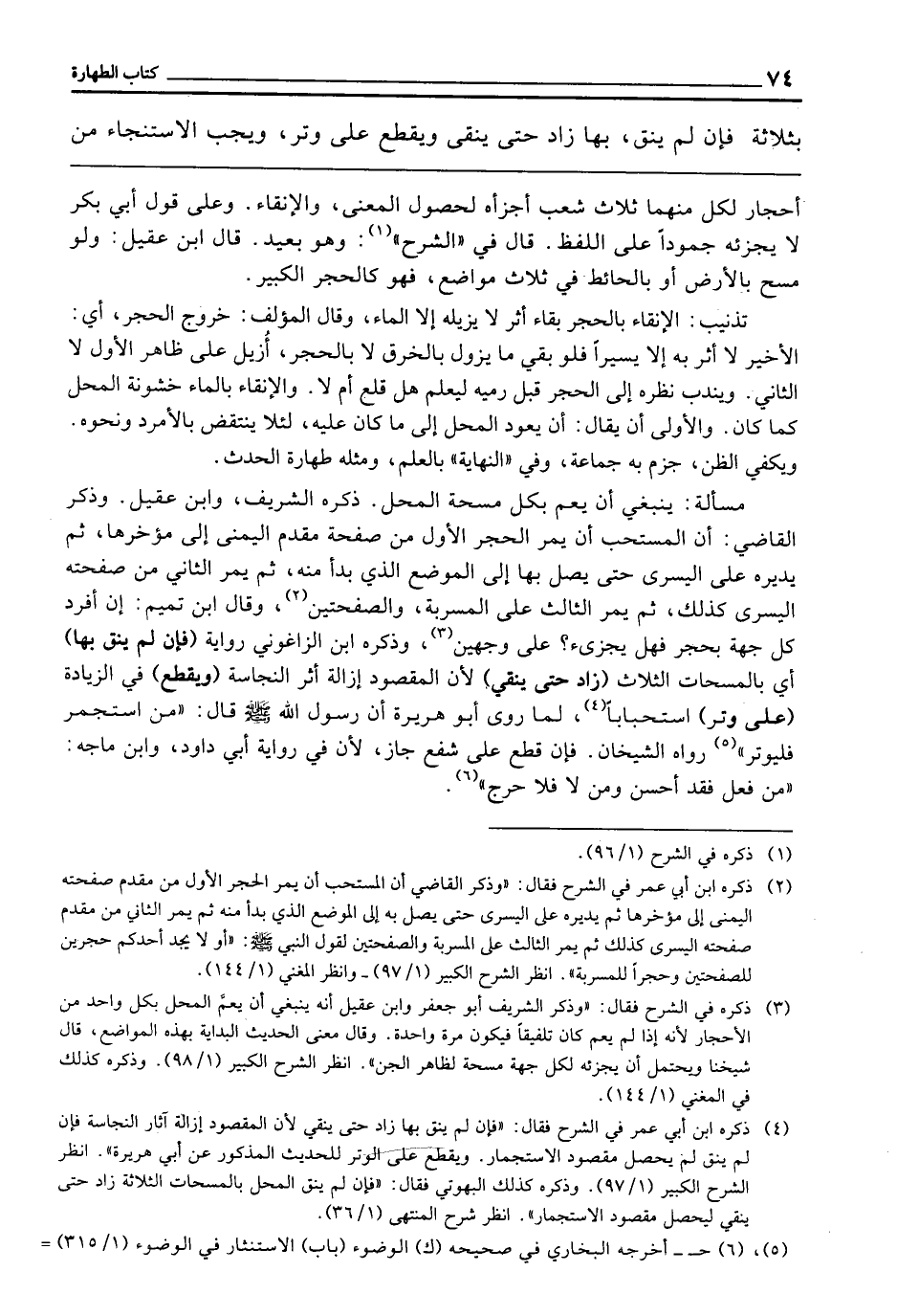 مَسْأَلَةٌ: يَنْبَغِي أَنْ يَعُمَّ بِكُلِّ مَسْحَةٍ الْمَحَلَّ. ذَكَرَهُ الشَّرِيفُ، وَابْنُ عَقِيلٍ، وَذَكَرَ الْقَاضِي: أَنَّ الْمُسْتَحَبَّ أَنْ يُمِرَّ الْحَجَرَ الْأَوَّلَ مِنْ صَفْحَةِ مُقَدَّمِ الْيُمْنَى إِلَى مُؤَخَّرِهَا، ثُمَّ يُدِيرُهُ عَلَى الْيُسْرَى حَتَّى يَصِلَ بِهَا إِلَى الْمَوْضِعِ الَّذِي بَدَأَ مِنْهُ، ثُمَّ يُمِرُّ الثَّانِيَ مِنْ صَفْحَتِهِ الْيُسْرَى كَذَلِكَ، ثُمَّ الثَّالِثَ عَلَى الْمَسْرُبَةِ، وَالصَّفْحَتَيْنِ، وَقَالَ ابْنُ تَمِيمٍ: إِنْ أَفْرَدَ كُلَّ جِهَةٍ بِحَجَرٍ فَهَلْ يُجْزِئُ؛ عَلَى وَجْهَيْنِ، وَذَكَرَهُ ابْنُ الزَّاغُونِيِّ رِوَايَةً (فَإِنْ لَمْ يُنَقَّ بِهَا) أَيْ: بِالْمَسَحَاتِ الثَّلَاثِ (زَادَ حَتَّى يُنَقَّى) لِأَنَّ الْمَقْصُودَ إِزَالَةُ أَثَرِ النَّجَاسَةِ (وَيَقْطَعُ) فِي الزِّيَادَةِ (عَلَى وِتْرٍ) اسْتِحْبَابًا لِمَا رَوَى أَبُو هُرَيْرَةَ أَنَّ رَسُولَ اللَّهِ - صَلَّى اللَّهُ عَلَيْهِ وَسَلَّمَ - قَالَ: «مَنِ اسْتَجْمَرَ فَلْيُوتِرْ» رَوَاهُ الشَّيْخَانِ، فَإِنْ قَطَعَ عَلَى شَفْعٍ جَازَ، لِأَنَّ فِي رِوَايَةِ أَبِي دَاوُدَ، وَابْنِ مَاجَهْ «مَنْ فَعَلَ فَقَدْ أَحْسَنَ، وَمَنْ لَا فَلَا حَرَجَ» .