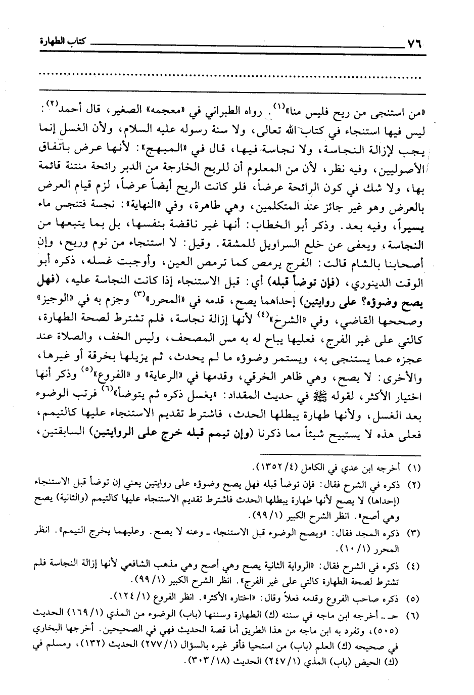 ـــــــــــــــــــــــــــــQ «مَنِ اسْتَنْجَى مِنْ رِيحٍ فَلَيْسَ مِنَّا» رَوَاهُ الطَّبَرَانِيُّ فِي " مُعْجَمِهِ " الصَّغِيرِ، قَالَ أَحْمَدُ: لَيْسَ فِيهَا اسْتِنْجَاءٌ فِي كِتَابِ اللَّهِ تَعَالَى، وَلَا سُنَّةِ رَسُولِهِ - عَلَيْهِ السَّلَامُ -، وَلِأَنَّ الْغَسْلَ إِنَّمَا يَجِبُ لِإِزَالَةِ النَّجَاسَةِ، وَلَا نَجَاسَةَ فِيهَا، قَالَ فِي " الْمُبْهِجِ ": لِأَنَّهَا عَرَضٌ بِاتِّفَاقِ الْأُصُولِيِّينَ، وَفِيهِ نَظَرٌ، لِأَنَّ مِنَ الْمَعْلُومِ أَنَّ لِلرِّيحِ الْخَارِجَةِ مِنَ الدُّبُرِ رَائِحَةً مُنْتِنَةً قَائِمَةً بِهَا، وَلَا شَكَّ فِي كَوْنِ الرَّائِحَةِ عَرَضًا، فَلَوْ كَانَتِ الرِّيحُ أَيْضًا عَرَضًا، لَزِمَ قِيَامُ الْعَرَضِ بِالْعَرَضِ وَهُوَ غَيْرُ جَائِزٍ عِنْدَ الْمُتَكَلِّمِينَ، وَهِيَ طَاهِرَةٌ، وَفِي " النِّهَايَةِ " نَجِسَةٌ فَتُنَجِّسُ مَاءً يَسِيرًا، وَفِيهِ بُعْدٌ، وَذَكَرَ أَبُو الْخَطَّابِ: أَنَّهَا غَيْرُ نَاقِصَةٍ بِنَفْسِهَا، بَلْ بِمَا يَتْبَعُهَا مِنَ النَّجَاسَةِ، وَيُعْفَى عَنْ خَلْعِ السَّرَاوِيلِ لِلْمَشَقَّةِ، وَقِيلَ: لَا اسْتِنْجَاءَ مِنْ نَوْمٍ وَرِيحٍ، وَإِنَّ أَصْحَابَنَا بِالشَّامِ قَالَتْ: الْفَرْجُ يَرْمَصُ كَمَا تَرْمَصُ الْعَيْنُ، وَأَوْجَبَتْ غَسْلَهُ، ذَكَرَهُ أَبُو الْوَقْتِ الدِّينَوَرِيُّ (فَإِنْ تَوَضَّأَ قَبْلَهُ) أَيْ: قَبْلَ الِاسْتِنْجَاءِ إِذَا كَانَتِ النَّجَاسَةُ عَلَيْهِ (فَهَلْ يَصِحُّ وُضُوءُهُ؛ عَلَى رِوَايَتَيْنِ) إِحْدَاهُمَا: يَصِحُّ، قَدَّمَهُ فِي " الْمُحَرَّرِ " وَجَزَمَ بِهِ فِي " الْوَجِيزِ " وَصَحَّحَهَا الْقَاضِي، وَفِي " الشَّرْحِ " لِأَنَّهَا إِزَالَةُ نَجَاسَةٍ، فَلَمْ تُشْتَرَطْ لِصِحَّةِ الطَّهَارَةِ، كَالَّتِي عَلَى غَيْرِ الْفَرْجِ، فَعَلَيْهَا يُبَاحُ لَهُ بِهِ مَسُّ الْمُصْحَفِ، وَلُبْسُ الْخُفِّ، وَالصَّلَاةُ عِنْدَ عَجْزِهِ عَمَّا يُسْتَنْجَى بِهِ، وَيَسْتَمِرُّ وُضُوءُهُ مَا لَمْ يُحْدِثْ، ثُمَّ يُزِيلُهَا بِخِرْقَةٍ، أَوْ غَيْرِهَا، وَالْأُخْرَى: لَا يَصِحُّ، وَهِيَ ظَاهِرُ الْخِرَقِيِّ، وَقَدَّمَهَا فِي " الرِّعَايَةِ "، و" الْفُرُوعِ "، وَذَكَرَ أَنَّهَا اخْتِيَارُ الْأَكْثَرِ لِقَوْلِهِ - صَلَّى اللَّهُ عَلَيْهِ وَسَلَّمَ - فِي حَدِيثِ الْمِقْدَادِ: «يَغْسِلُ ذَكَرَهُ، ثُمَّ يَتَوَضَّأُ» فَرَتَّبَ الْوُضُوءَ بَعْدَ الْغَسْلِ، وَلِأَنَّهَا طَهَارَةٌ يُبْطِلُهَا الْحَدَثُ، فَاشْتَرَطَ تَقْدِيمَ الِاسْتِنْجَاءِ عَلَيْهَا كَالتَّيَمُّمِ، فَعَلَى هَذِهِ لَا يَسْتَبِيحُ شَيْئًا مِمَّا ذَكَرْنَا (وَإِنْ تَيَمَّمَ قَبْلَهُ خَرَجَ عَلَى الرِّوَايَتَيْنِ) السَّابِقَتَيْنِ،