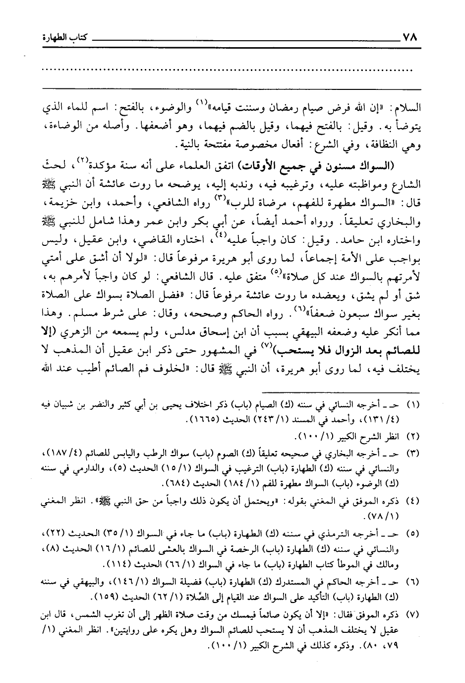 (السِّوَاكُ مَسْنُونٌ فِي جَمِيعِ الْأَوْقَاتِ) اتَّفَقَ الْعُلَمَاءُ عَلَى أَنَّهُ سُنَّةٌ مُؤَكَّدَةٌ، لِحَثِّ الشَّارِعِ، وَمُوَاظَبَتِهِ عَلَيْهِ، وَتَرْغِيبِهِ فِيهِ، وَنَدْبِهِ إِلَيْهِ، يُوَضِّحُهُ مَا رَوَتْ عَائِشَةُ أَنَّ النَّبِيَّ - صَلَّى اللَّهُ عَلَيْهِ وَسَلَّمَ - قَالَ: «السِّوَاكُ مَطْهَرَةٌ لِلْفَمِ مَرْضَاةٌ لِلرَّبِّ» رَوَاهُ الشَّافِعِيُّ، وَأَحْمَدُ، وَابْنُ خُزَيْمَةَ، وَالْبُخَارِيُّ تَعْلِيقًا، وَرَوَاهُ أَحْمَدُ أَيْضًا، عَنْ أَبِي بَكْرٍ وَابْنِ عُمَرَ، وَهَذَا شَامِلٌ لِلنَّبِيِّ - صَلَّى اللَّهُ عَلَيْهِ وَسَلَّمَ - وَاخْتَارَهُ ابْنُ حَامِدٍ، وَقِيلَ: كَانَ وَاجِبًا عَلَيْهِ، اخْتَارَهُ الْقَاضِي، وَابْنُ عَقِيلٍ، وَلَيْسَ بِوَاجِبٍ عَلَى الْأُمَّةِ إِجْمَاعًا، لِمَا رَوَى أَبُو هُرَيْرَةَ مَرْفُوعًا قَالَ: «لَوْلَا أَنْ أَشُقَّ عَلَى أُمَّتِي لَأَمَرْتُهُمْ بِالسِّوَاكِ عِنْدَ كُلِّ صَلَاةٍ» مُتَّفَقٌ عَلَيْهِ. قَالَ الشَّافِعِيُّ: لَوْ كَانَ وَاجِبًا لَأَمَرَهُمْ بِهِ، شَقَّ أَوْ لَمْ يَشُقَّ، وَيُعَضِّدُهُ مَا رَوَتْ عَائِشَةُ مَرْفُوعًا قَالَ: «فَضْلُ الصَّلَاةِ بِسِوَاكٍ عَلَى الصَّلَاةِ بِغَيْرِ سِوَاكٍ سَبْعُونَ ضِعْفًا» رَوَاهُ الْحَاكِمُ، وَصَحَّحَهُ، وَقَالَ عَلَى شَرْطِ مُسْلِمٍ، وَهَذَا مِمَّا أُنْكِرَ عَلَيْهِ، وَضَعَّفَهُ الْبَيْهَقِيُّ بِسَبَبِ أَنَّ ابْنَ إِسْحَاقَ مُدَلِّسٌ، وَلَمْ يَسْمَعْهُ مِنَ الزُّهْرِيِّ (إِلَّا لِلصَّائِمِ بَعْدَ الزَّوَالِ فَلَا يُسْتَحَبُّ) فِي الْمَشْهُورِ حَتَّى ذَكَرَ ابْنُ عَقِيلٍ: أَنَّ الْمَذْهَبَ لَا يَخْتَلِفُ فِيهِ لِمَا رَوَى أَبُو هُرَيْرَةَ أَنَّ النَّبِيَّ - صَلَّى اللَّهُ عَلَيْهِ وَسَلَّمَ - قَالَ: «لَخُلُوفُ فَمِ الصَّائِمِ أَطْيَبُ عِنْدَ اللَّهِ