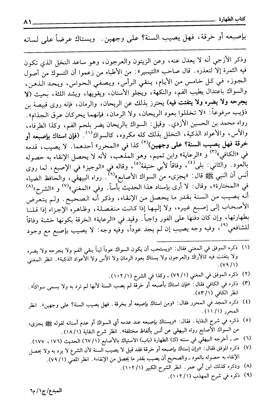 بِإِصْبُعِهِ أَوْ خِرْقَةٍ فَهَلْ يُصِيبُ السُّنَّةَ؛ عَلَى وَجْهَيْنِ، وَيَسْتَاكُ عَرْضًا عَلَى لِسَانِهِ،