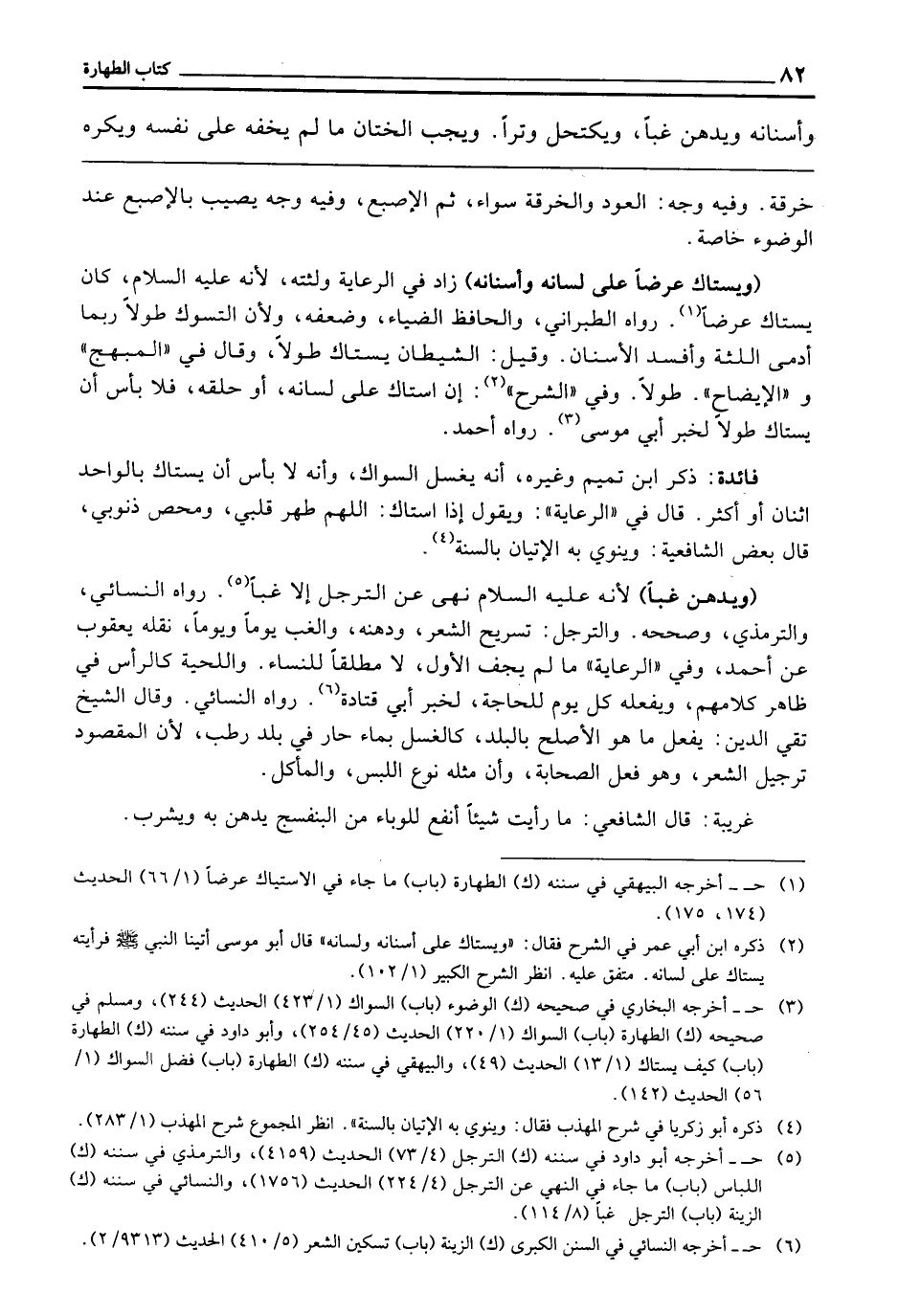 فَائِدَةٌ: ذَكَرَ ابْنُ تَمِيمٍ وَغَيْرُهُ أَنَّهُ يَغْسِلُ السِّوَاكَ، وَأَنَّهُ لَا بَأْسَ أَنْ يَسْتَاكَ بِالْوَاحِدِ اثْنَانِ، أَوْ أَكْثَرُ، قَالَ فِي " الرِّعَايَةِ ": وَيَقُولُ إِذَا اسْتَاكَ: اللَّهُمَّ طَهِّرْ قَلْبِي، وَمَحِّصْ ذُنُوبِي، قَالَ بَعْضُ الشَّافِعِيَّةِ: وَيَنْوِي بِهِ الْإِتْيَانَ بِالسُّنَّةِ.
