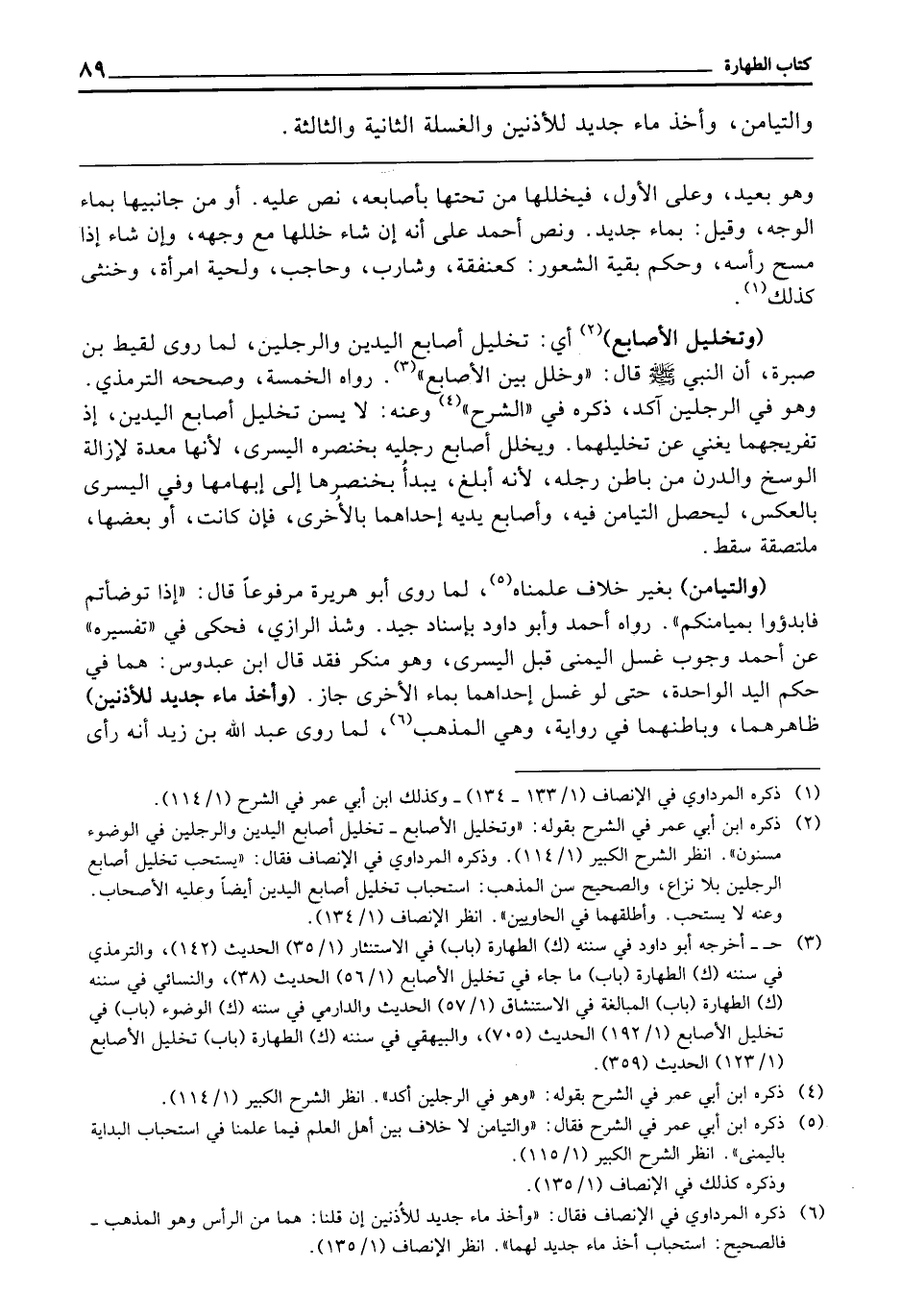 (وَالتَّيَامُنُ) بِغَيْرِ خِلَافٍ عَلِمْنَاهُ، لِمَا رَوَى أَبُو هُرَيْرَةَ مَرْفُوعًا قَالَ: «إِذَا تَوَضَّأْتُمْ فَابْدَءُوا بِمَيَامِنِكُمْ» رَوَاهُ أَحْمَدُ، وَأَبُو دَاوُدَ بِإِسْنَادٍ جَيِّدٍ، وَشَذَّ الرَّازِيُّ فَحَكَى فِي " تَفْسِيرِهِ " عَنْ أَحْمَدَ وُجُوبَ غَسْلِ الْيُمْنَى قَبْلَ الْيُسْرَى، وَهُوَ مُنْكَرٌ، فَقَدْ قَالَ ابْنُ عَبْدُوسٍ: هُمَا فِي حُكْمِ الْيَدِ الْوَاحِدَةِ، حَتَّى لَوْ غَسَلَ إِحْدَاهُمَا بِمَاءِ الْأُخْرَى جَازَ (وَأَخَذَ مَاءً جَدِيدًا لِلْأُذُنَيْنِ) ظَاهِرِهِمَا، وَبَاطِنِهِمَا فِي رِوَايَةٍ، وَهِيَ الْمَذْهَبُ، لِمَا رَوَى عَبْدُ اللَّهِ بْنُ زَيْدٍ: «أَنَّهُ رَأَى