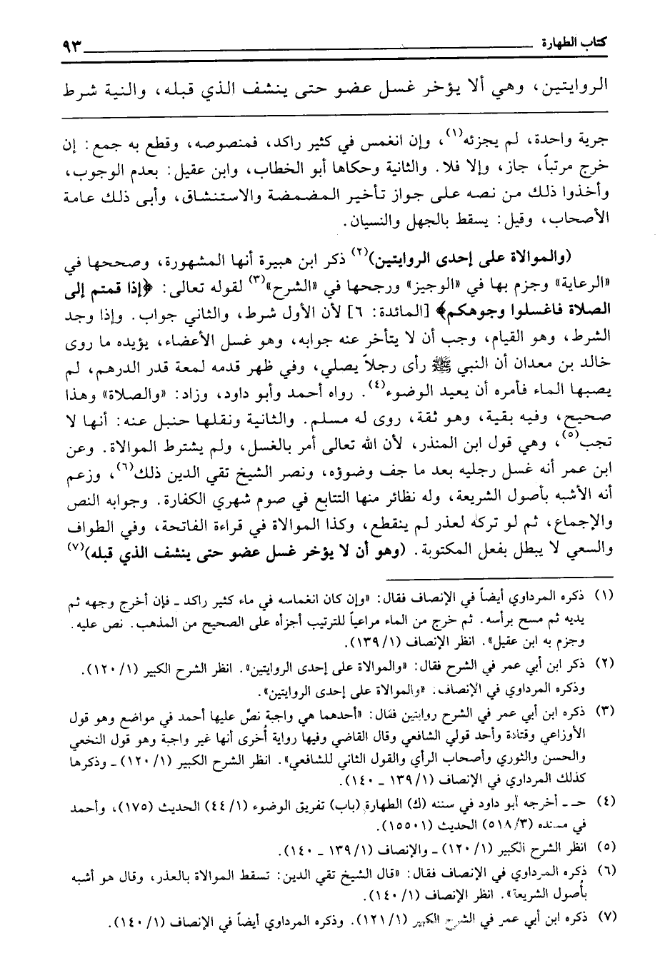 الرِّوَايَتَيْنِ، وَهِيَ أَلَّا يُؤَخِّرَ غَسْلَ عُضْوٍ حَتَّى يَنْشَفَ الَّذِي قَبْلَهُ، وَالنِّيَّةُ شَرْطٌ