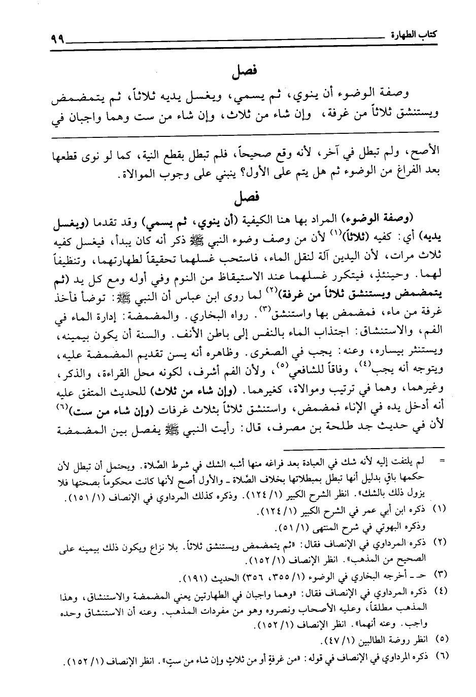 (أَنْ يَنْوِيَ، ثُمَّ يُسَمِّيَ) وَقَدْ تَقَدَّمَا (وَيَغْسِلَ يَدَيْهِ) أَيْ: كَفَّيْهِ (ثَلَاثًا) لِأَنَّ مَنْ وَصَفَ وُضُوءَ النَّبِيِّ - صَلَّى اللَّهُ عَلَيْهِ وَسَلَّمَ - ذَكَرَ أَنَّهُ كَانَ يَبْدَأُ فَيَغْسِلُ كَفَّيْهِ ثَلَاثَ مَرَّاتٍ، لِأَنَّ الْيَدَيْنِ آلَةٌ لِنَقْلِ الْمَاءِ، فَاسْتَحَبَّ غَسْلَهُمَا تَحْقِيقًا لِطَهَارَتِهِمَا، وَتَنْظِيفًا لَهُمَا، وَحِينَئِذٍ فَيَتَكَرَّرُ غَسْلُهُمَا عِنْدَ الِاسْتِيقَاظِ مِنَ النَّوْمِ، وَفِي أَوَّلِهِ، وَمَعَ كُلِّ يَدٍ (ثُمَّ يَتَمَضْمَضَ، وَيَسْتَنْشِقَ ثَلَاثًا مِنْ غَرْفَةٍ) لِمَا رَوَى ابْنُ عَبَّاسٍ: «أَنَّ النَّبِيَّ - صَلَّى اللَّهُ عَلَيْهِ وَسَلَّمَ - تَوَضَّأَ فَأَخَذَ غُرْفَةً مِنْ مَاءٍ فَمَضْمَضَ بِهَا، وَاسْتَنْشَقَ» رَوَاهُ الْبُخَارِيُّ، وَالْمَضْمَضَةُ: إِدَارَةُ الْمَاءِ فِي الْفَمِ، وَالِاسْتِنْشَاقُ: اجْتِذَابُ الْمَاءِ بِالنَّفَسِ إِلَى بَاطِنِ الْأَنْفِ، وَالسُّنَّةُ أَنْ يَكُونَ بِيَمِينِهِ، وَيَسْتَنْثِرَ بِيَسَارِهِ، وَعَنْهُ: يَجِبُ فِي الصُّغْرَى، وَظَاهِرُهُ أَنَّهُ يُسَنُّ تَقْدِيمُ الْمَضْمَضَةِ عَلَيْهِ، وَيَتَوَجَّهُ أَنَّهُ يَجِبُ وِفَاقًا لِلشَّافِعِيِّ، وَلِأَنَّ الْفَمَ أَشْرَفُ لِكَوْنِهِ مَحَلَّ الْقِرَاءَةِ، وَالذِّكْرِ، وَغَيْرِهِمَا، وَهُمَا فِي تَرْتِيبٍ وَمُوَالَاةٍ كَغَيْرِهِمَا (وَإِنْ شَاءَ مِنْ ثَلَاثٍ) لِلْحَدِيثِ الْمُتَّفَقِ عَلَيْهِ أَنَّهُ «أَدْخَلَ يَدَهُ فِي الْإِنَاءِ فَمَضْمَضَ، وَاسْتَنْشَقَ ثَلَاثًا بِثَلَاثِ غَرَفَاتٍ» (وَإِنْ شَاءَ مِنْ سِتٍّ) لِأَنَّ فِي حَدِيثِ جَدِّ طَلْحَةَ بْنِ مُصَرِّفٍ قَالَ: «رَأَيْتُ النَّبِيَّ - صَلَّى اللَّهُ عَلَيْهِ وَسَلَّمَ - يَفْصِلُ بَيْنَ الْمَضْمَضَةِ،