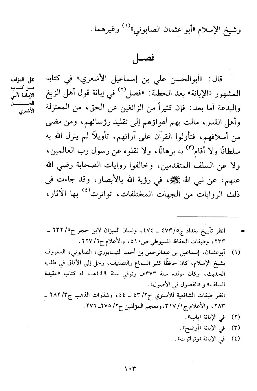 قال «أبو الحسن علي بن إسماعيل الأشعري» في كتابه المشهور «الإبانة» بعد الخطبة: «فصل في إبانة قول أهل الزيغ والبدعة أما بعد: فإن كثيرًا من الزائغين عن الحق، من المعتزلة وأهل القدر، مالت بهم أهواؤهم إلى تقليد رؤسائهم، ومن مضى من أسلافهم، فتأولوا القرآن على آرائهم، تأويلًا لم ينزل الله به سلطانًا ولا أقام به برهانًا، ولا نقلوه عن رسول رب العالمين، ولا عن السلف المتقدمين، وخالفوا روايات الصحابة رضي الله عنهم، عن نبي الله صلى الله عليه وسلم، في رؤية الله بالأبصار، وقد جاءت في ذلك الروايات من الجهات المختلفات، تواترت بها الآثار،