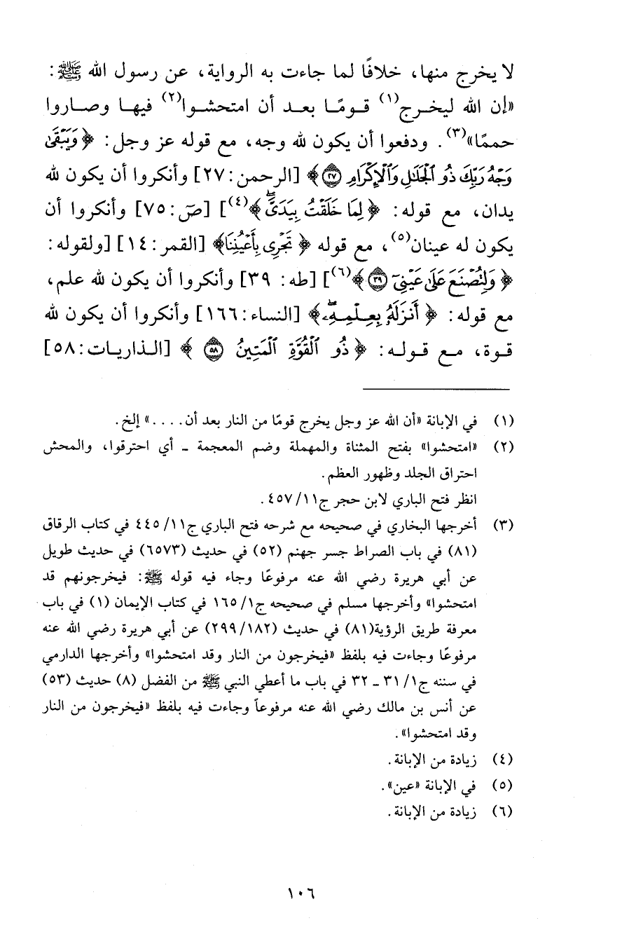 لا يخرج منها، خلافًا لما جاءت به الرواية، عن رسول الله صلى الله عليه وسلم: «إن الله ليخرج قومًا بعد أن امتحشوا فيها وصاروا حممًا» . ودفعوا أن يكون لله وجه، مع قوله عز وجل: {وَيَبْقَى وَجْهُ رَبِّكَ ذُو الْجَلَالِ وَالْإِكْرَامِ (27) } [الرحمن: 27] وأنكروا أن يكون لله يدان، مع قوله: {لِمَا خَلَقْتُ بِيَدَيَّ} ] [ص: 75] وأنكروا أن يكون له عينان، مع قوله {تَجْرِي بِأَعْيُنِنَا} [القمر: 14] [ولقوله: {وَلِتُصْنَعَ عَلَى عَيْنِي (39) } ] [طه: 39] وأنكروا أن يكون لله علم، مع قوله: {أَنزَلَهُ بِعِلْمِهِ} [النساء: 166] وأنكروا أن يكون لله قوة، مع قوله: {ذُو الْقُوَّةِ الْمَتِينُ (58) } [الذريات: 58]