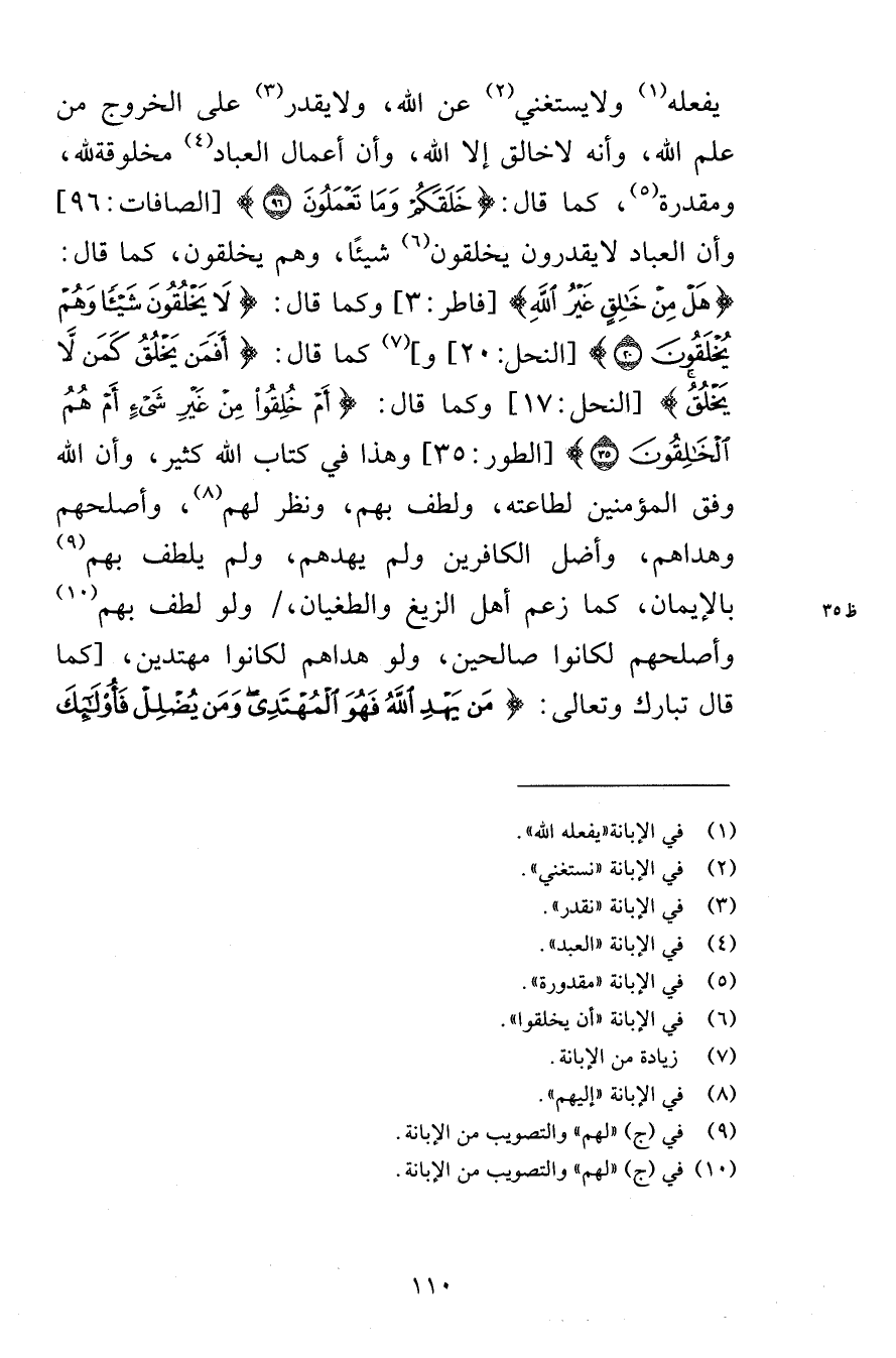 يفعله ولا يستغني عن الله، ولا يقدر على الخروج من علم الله، وأنه لا خالق إلا الله، وأن أعمال العباد مخلوقة لله، ومقدرة، كما قال: {خَلَقَكُمْ وَمَا تَعْمَلُونَ (96) } [الصافات: 96] وأن العباد لا يقدرون يخلقون شيئًا، وهم يخلقون، كما قال: {هَلْ مِنْ خَالِقٍ غَيْرُ اللَّهِ} [فاطر: 3] وكما قال: {لَا يَخْلُقُونَ شَيْئًا وَهُمْ يُخْلَقُونَ (20) } [النحل: 20] و] كما قال: {أَفَمَنْ يَخْلُقُ كَمَنْ لَا يَخْلُقُ} [النحل: 17] وكما قال: {أَمْ خُلِقُوا مِنْ غَيْرِ شَيْءٍ أَمْ هُمُ الْخَالِقُونَ (35) } [الطور: 35] وهذا في كتاب الله كثير، وأن الله وفق المؤمنين لطاعته، ولطف بهم، ونظر لهم، وأصلحهم وهداهم، وأضل الكافرين ولم يهدهم، ولم يلطف بهم بالإيمان، كما زعم أهل الزيغ والطغيان، ولو لطف بهم وأصلحهم لكانوا صالحين، ولو هداهم لكانوا مهتدين، [كما قال تبارك وتعالى: {مَن يَهْدِ اللَّهُ فَهُوَ الْمُهْتَدِي وَمَن يُضْلِلْ فَأُولَئِكَ