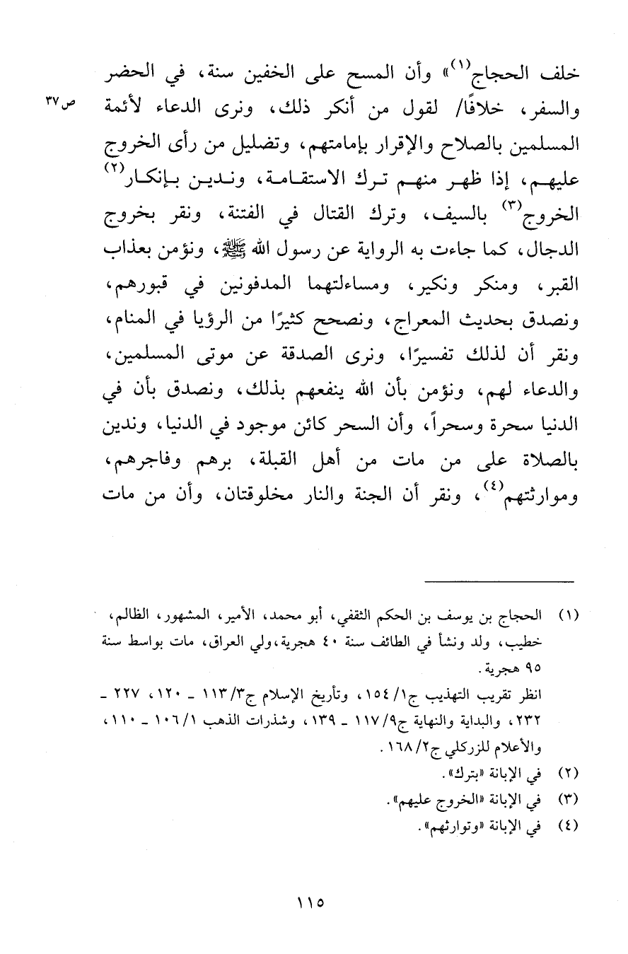 خلف الحجاج» وأن المسح على الخفين سنة، في الحضر والسفر، خلافًا لقول من أنكر ذلك، ونرى الدعاء لأئمة المسلمين بالصلاح والإقرار بإمامتهم، وتضليل من رأى الخروج عليهم، إذا ظهر منهم ترك الاستقامة، وندين بإنكار الخروج بالسيف، وترك القتال في الفتنة، ونقر بخروج الدجال، كما جاءت به الرواية عن رسول الله صلى الله عليه وسلم، ونؤمن بعذاب القبر، ومنكر ونكير، ومساءلتهما المدفونين في قبورهم، ونصدق بحديث المعراج، ونصحح كثيرًا من الرؤيا في المنام، ونقر أن لذلك تفسيرًا، ونرى الصدقة عن موتى المسلمين، والدعاء لهم، ونؤمن بأن الله ينفعهم بذلك، ونصدق بأن في الدنيا سحرة وسحرًا، وأن السحر كائن موجود في الدنيا، وندين بالصلاة على من مات من أهل القبلة، برهم وفاجرهم، وموارثتهم، ونقر أن الجنة والنار مخلوقتان، وأن من مات