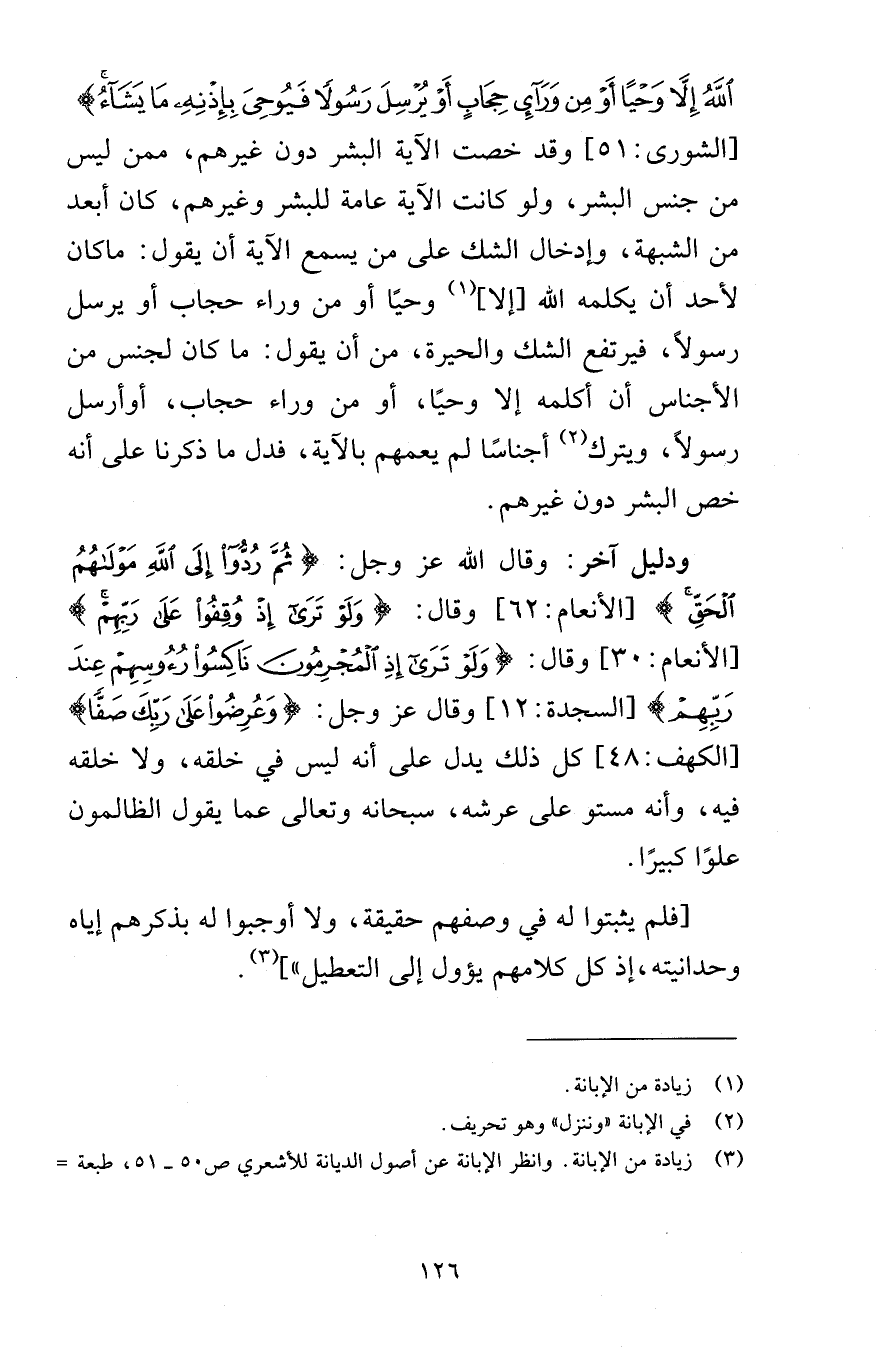 اللَّهُ إِلَّا وَحْيًا أَوْ مِن وَرَاءِ حِجَابٍ أَوْ يُرْسِلَ رَسُولًا فَيُوحِيَ بِإِذْنِهِ مَا يَشَاءُ} [الشورى: 51] وقد خصت الآية البشر دون غيرهم، ممن ليس من جنس البشر، ولو كانت الآية عامة للبشر وغيرهم، كان أبعد من الشبهة، وإدخال الشك على من يسمع الآية أن يقول: ما كان لأحد أن يكلمه الله [إلا] وحيًا أو من وراء حجاب أو يرسل رسولًا، فيرتفع الشك والحيرة، من أن يقول: ما كان لجنس من الأجناس أن أكلمه إلا وحيًا، أو من وراء حجاب، أو أرسل رسولًا، ويترك أجناسًا لم يعمهم بالآية، فدل ما ذكرنا على أنه خص البشر دون غيرهم.