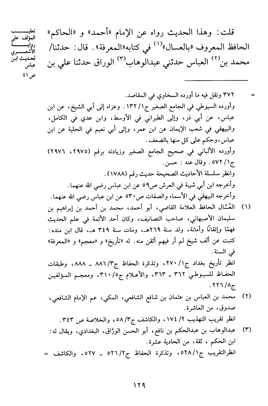قلت: وهذا الحديث رواه عن الإمام «أحمد» و «الحاكم» الحافظ المعروف «بالعسال» في كتابه «المعرفة» . قال: حدثنا محمد بن العباس حدثني عبد الوهاب الوراق حدثنا علي بن