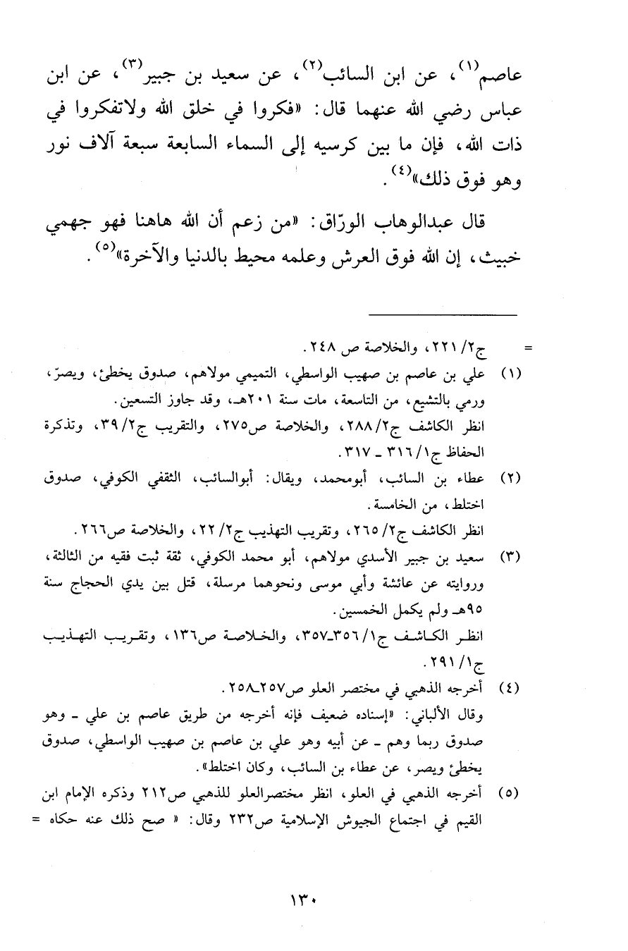 عاصم، عن ابن السائب، عن سعيد بن جبير، عن ابن عباس رضي الله عنهما قال: «فكروا في خلق الله ولا تفكروا في ذات الله، فإن ما بين كرسيه إلى السماء السابعة سبعة آلاف نور وهو فوق ذلك» .