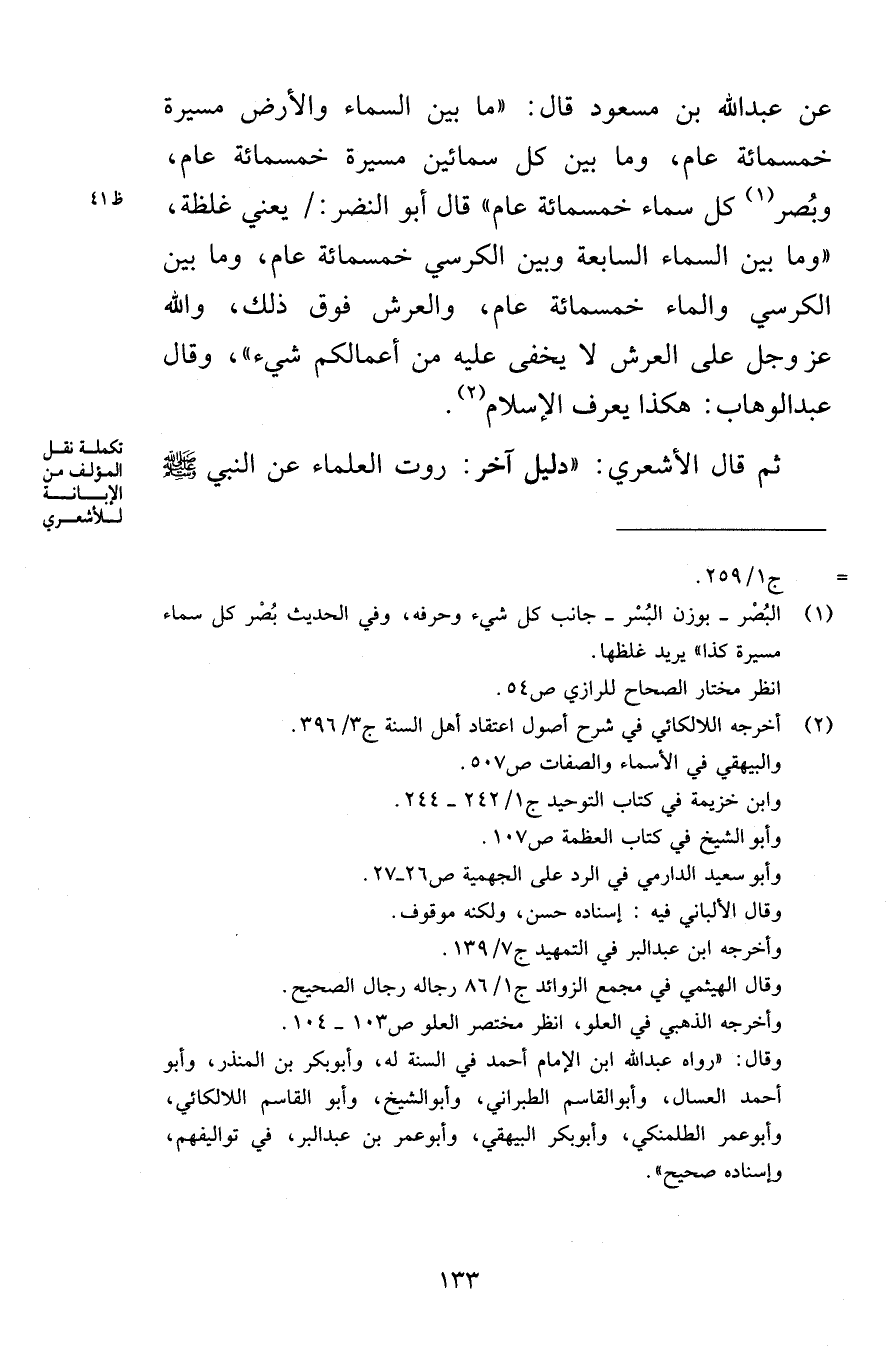 عن عبد الله بن مسعود قال: «ما بين السماء والأرض مسيرة خمسمائة عام، وما بين كل سمائين مسيرة خمسمائة عام، وبُصر كل سماء خمسمائة عام» قال أبو النضر: يعني غلظة، «وما بين السماء السابعة وبين الكرسي خمسمائة عام، وما بين الكرسي والماء خمسمائة عام، والعرش فوق ذلك، والله عز وجل على العرش لا يخفى عليه من أعمالكم شيء» ، وقال عبد الوهاب: هكذا يعرف الإسلام.