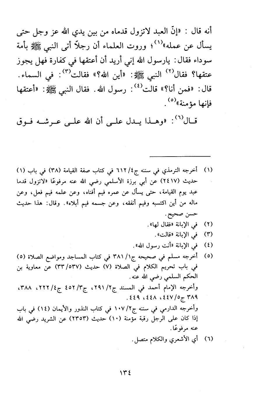 أنه قال: «إنّ العبد لا تزول قدماه من بين يدي الله عز وجل حتى يسأل عن عمله» ؛ وروت العلماء أن رجلًا أتى النبي صلى الله عليه وسلم بأمة سوداء فقال: يا رسول الله إني أريد أن أعتقها في كفارة فهل يجوز عتقها؟ فقال النبي صلى الله عليه وسلم: «أين الله؟» فقالت: في السماء. قال: «فمن أنا؟» قالت: رسول الله. فقال النبي صلى الله عليه وسلم: «أعتقها فإنها مؤمنة» .