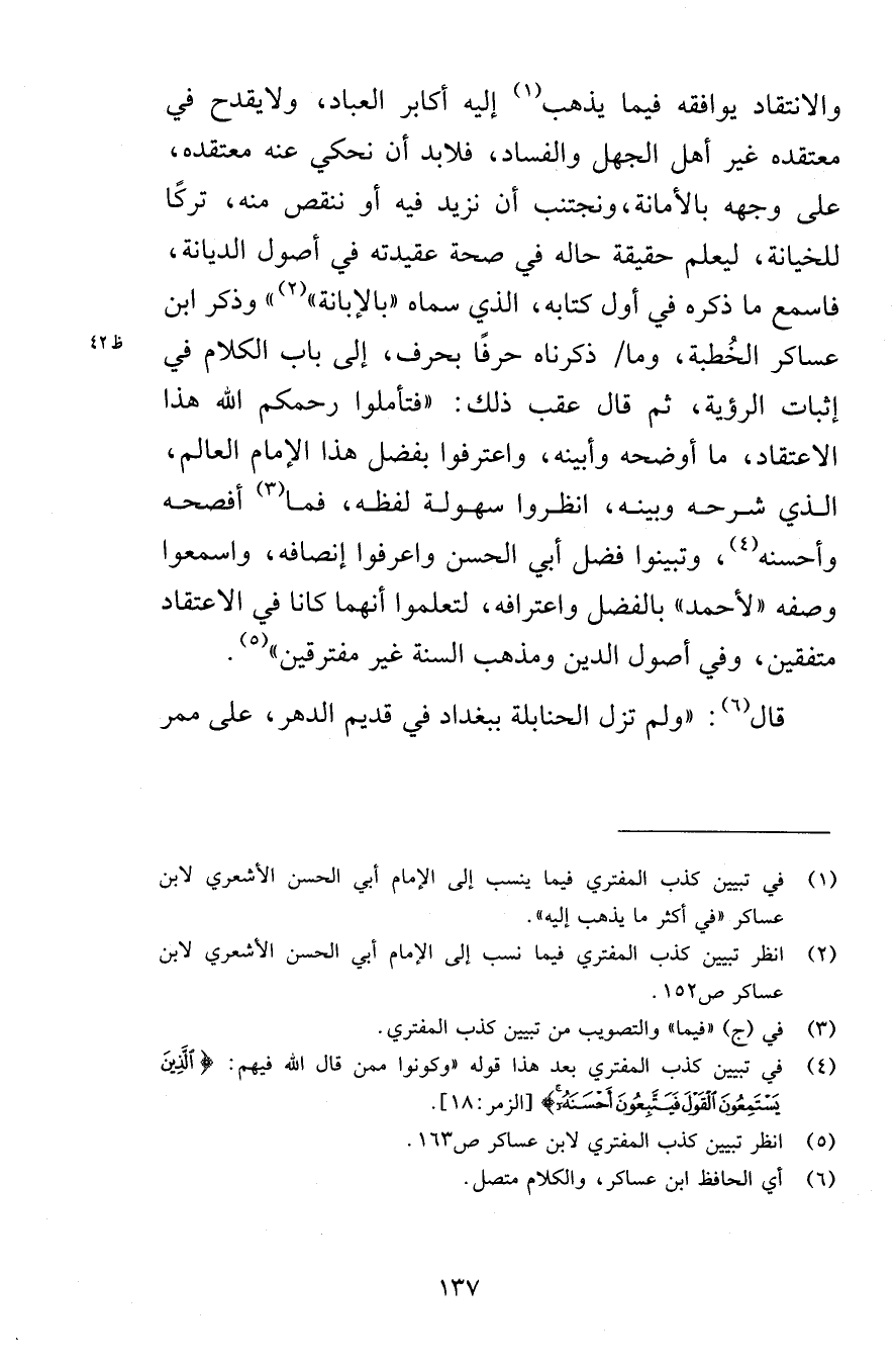 والانتقاد يوافقه فيما يذهب إليه أكابر العباد، ولا يقدح في معتقده غير أهل الجهل والفساد، فلا بد أن نحكي عنه معتقده، على وجهه بالأمانة، ونجتنب أن نزيد فيه أو ننقص منه، تركًا للخيانة، ليعلم حقيقة حاله في صحة عقيدته في أصول الديانة، فاسمع ما ذكره في أول كتابه، الذي سماه «بالإبانة» » وذكر ابن عساكر الخُطبة، وما ذكرناه حرفًا بحرف، إلى باب الكلام في إثبات الرؤية، ثم قال عقب ذلك: «فتأملوا رحمكم الله هذا الاعتقاد ما أوضحه وأبينه، واعترفوا بفضل هذا الإمام العالم، الذي شرحه وبينه، انظروا سهولة لفظه، فما أفصحه وأحسنه، وتبينوا فضل أبي الحسن واعرفوا إنصافه، واسمعوا وصفه «لأحمد» بالفضل واعترافه، لتعلموا أنهما كانا في الاعتقاد متفقين، وفي أصول الدين ومذهب السنة غير مفترقين» .