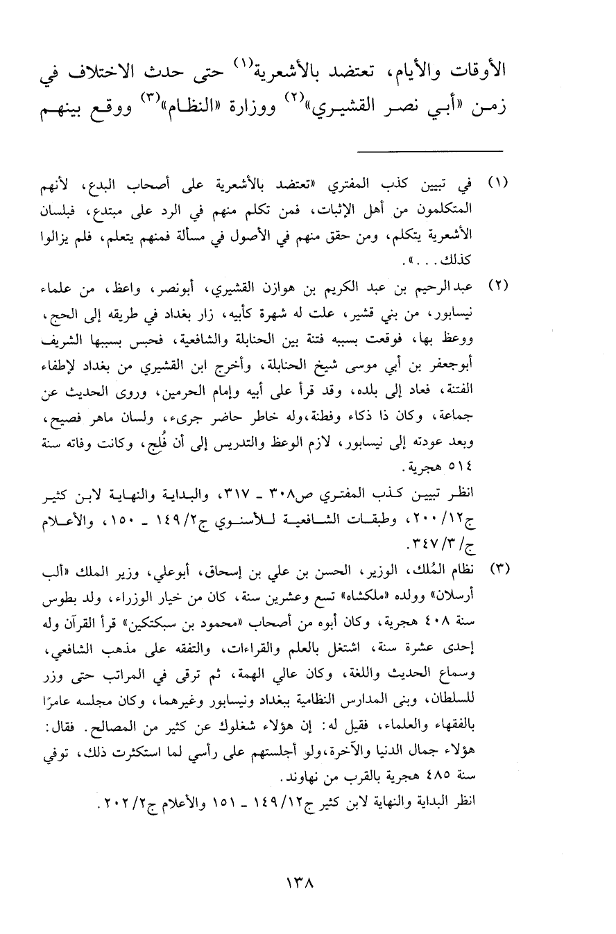 الأوقات والأيام، تعتضد بالأشعرية حتى حدث الاختلاف في زمن «أبي نصر القشيري» ووزارة «النظام» ووقع بينهم