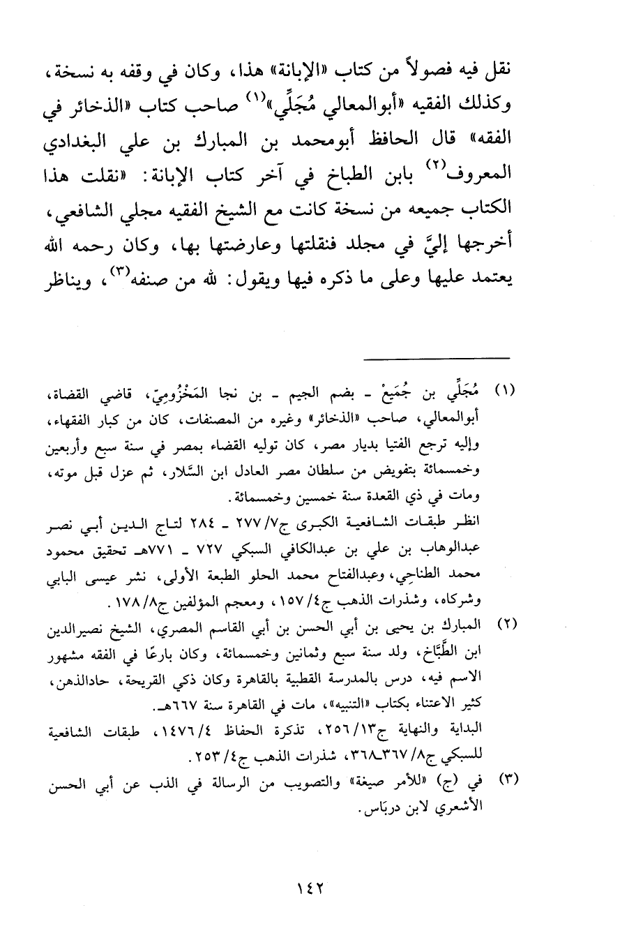 نقل فيه فصولًا من كتاب «الإبانة» هذا، وكان في وقفه به نسخة، وكذلك الفقيه «أبو المعالي مُجَلِّي» صاحب كتاب «الذخائر في الفقه» قال الحافظ أبو محمد بن المبارك بن علي البغدادي المعروف بابن الطباخ في آخر كتاب الإبانة: «نقلت هذا الكتاب جميعه من نسخة كانت مع الشيخ الفقيه مجلي الشافعي، أخرجها إليَّ في مجلد فنقلتها وعارضتها بها، وكان رحمه الله يعتمد عليها وعلى ما ذكره فيها ويقول: لله من صنفه، ويناظر