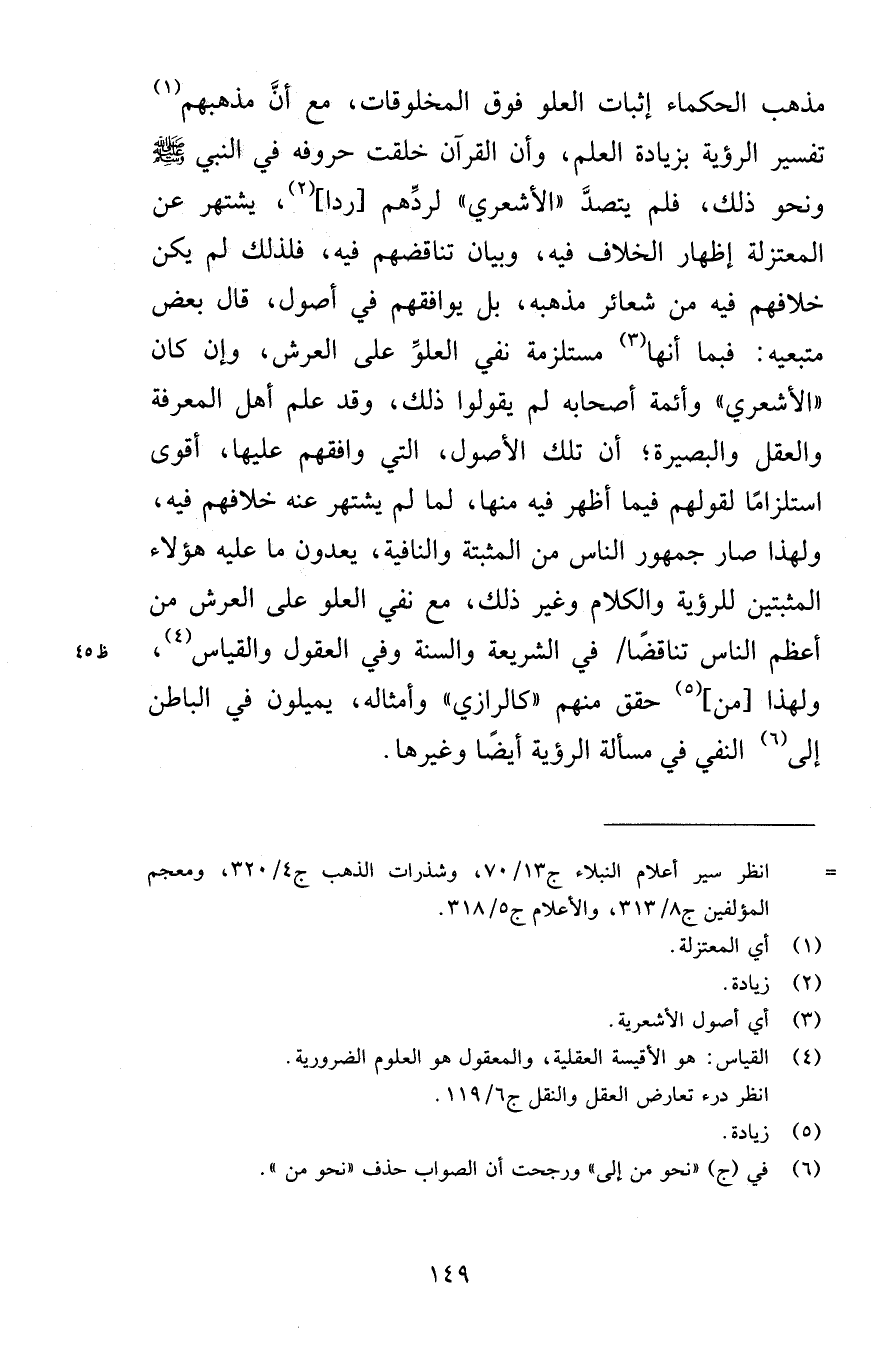 مذهب الحكماء إثبات العلو فوق المخلوقات، مع أنَّ مذهبهم تفسير الرؤية بزيادة العلم، وأن القرآن خلقت حروفه في النبي صلى الله عليه وسلم ونحو ذلك، فلم يتصدَّ «الأشعري» لردِّهم [ردا] ، يشتهر عن المعتزلة إظهار الخلاف فيه، وبيان تناقضهم فيه، فلذلك لم يكن خلافهم فيه من شعائر مذهبه، بل يوافقهم في أصول، قال بعض متبعيه: فبما أنها مستلزمة نفي العلوِّ على العرش، وإن كان «الأشعري» وأئمة أصحابه لم يقولوا ذلك، وقد علم أهل العلم المعرفة والعقل والبصيرة؛ أن تلك الأصول، التي وافقهم عليها، أقوى استلزامًا لقولهم فيما أظهر فيه منها، لما لم يشتهر عنه خلافهم فيه، ولهذا صار جمهور الناس من المثبتة والنافية، يعدون ما عليه هؤلاء المثبتين للرؤية والكلام وغير ذلك، مع نفي العلو على العرش من أعظم الناس تناقضًا في الشريعة والسنة وفي العقول والقياس، ولهذا [من] حقق منهم «كالرازي» وأمثاله، يميلون في الباطن إلى النفي في مسألة الرؤية أيضًا وغيرها.