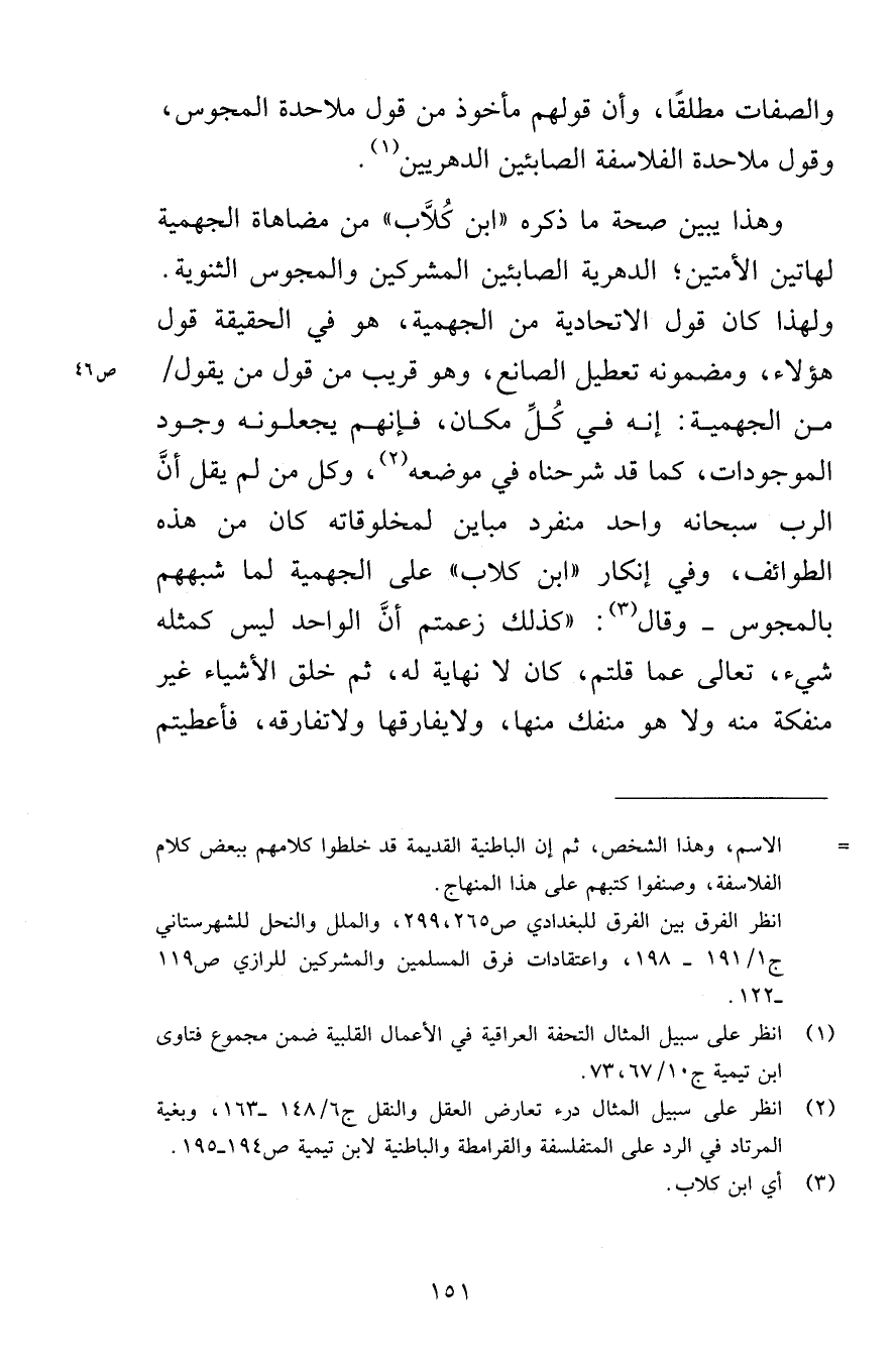 وهذا يبين صحة ما ذكره «ابن كُلَّاب» من مضاهاة الجهمية لهاتين الأمتين؛ الدهرية الصابئين المشركين والمجوس الثنوية. ولهذا كان قول الاتحادية من الجهمية، هو في الحقيقة قول هؤلاء، ومضمونه تعطيل الصانع، وهو قريب من قول من يقول من الجهمية: إنه في كُلِّ مكان، فإنهم يجعلونه وجود الموجودات، كما قد شرحنا في موضعه، وكل من لم يقل أنَّ الرب سبحانه واحد منفرد مباين لمخلوقاته كان من هذه الطوائف، وفي إنكار «ابن كلاب» على الجهمية لما شبههم بالمجوس -وقال: «كذلك زعمتم أنَّ الواحد ليس كمثله شيء، تعالى عما قلتم، كان لا نهاية له، ثم خلق الأشياء غير منفكة منه ولا هو منفك منها، ولا يفارقها ولا تفارقه، فأعطيتم