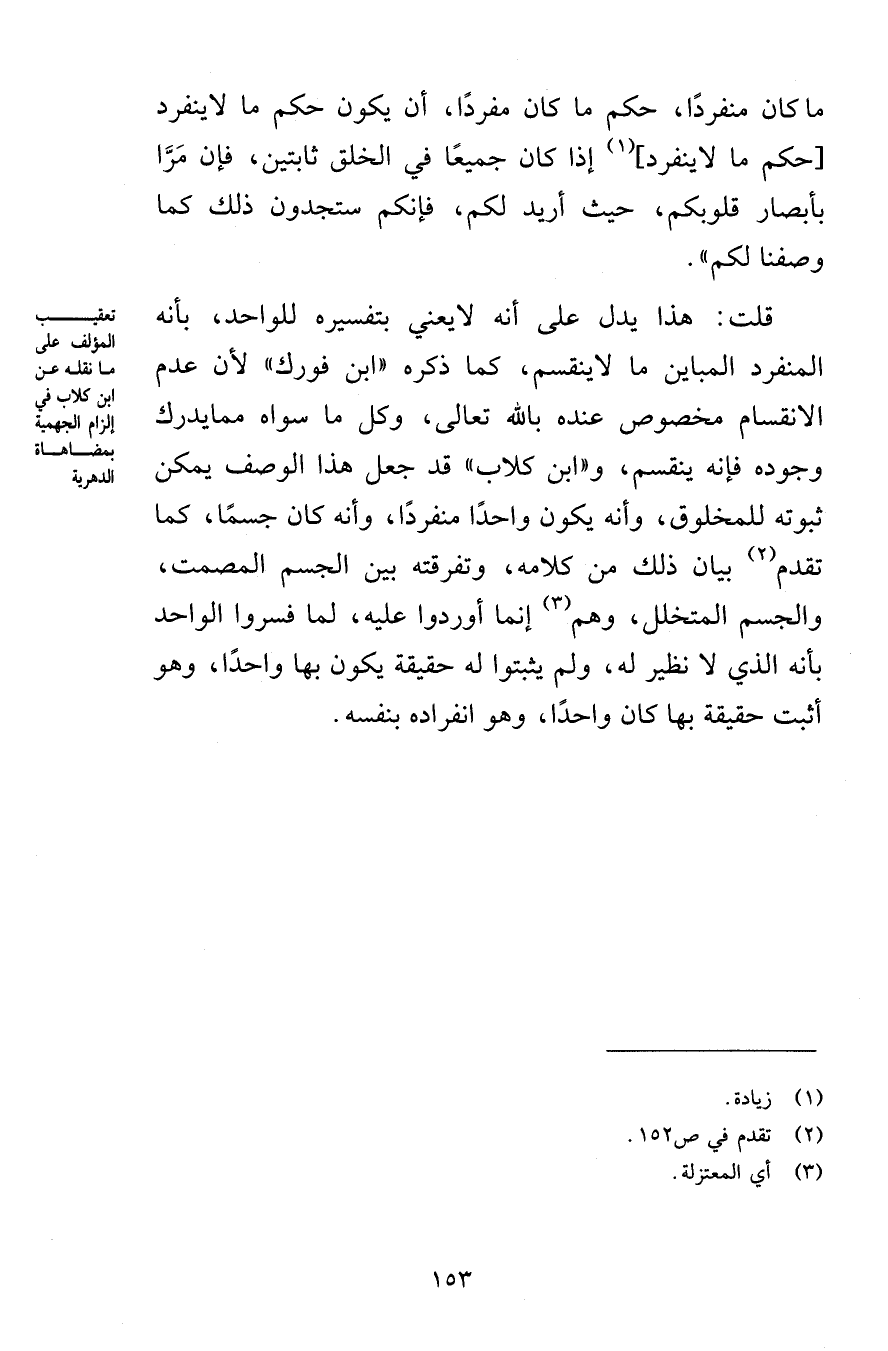 قلت: هذا يدل على أنه لا يعني بتفسيره للواحد، بأنه المنفرد المباين ما لا ينقسم، كما ذكره «ابن فورك» لأن عدم الانقسام مخصوص عنده بالله تعالى، وكل ما سواه مما يدرك وجوده فإنه ينقسم، و «ابن كلاب» قد جعل هذا الوصف يمكن ثبوته للمخلوق، وأنه يكون واحدًا منفردًا، وأنه كان جسمًا، كما تقدم بيان ذلك من كلامه، وتفرقته بين الجسم المصمت، والجسم المتخلل، وهم إنما أوردوا عليه، لما فسروا الواحد بأنه الذي لا نظير له، ولم يثبتوا له حقيقة يكون بها واحدًا، وهو أثبت حقيقة بها كان واحدًا، وهو انفراده بنفسه.