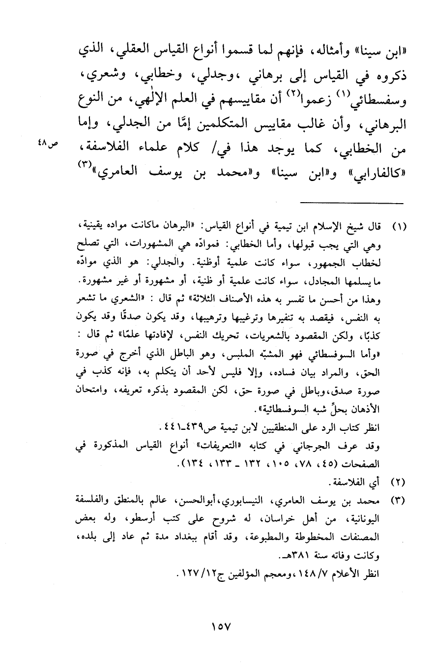 «ابن سينا» وأمثاله، فإنهم لما قسموا أنواع القياس العقلي، الذي ذكروه في القياس إلى برهاني، وجدلي، وخطابي، وشعري، وسفسطائي زعموا أن مقاييسهم في العلم الإلهي، من النوع البرهاني، وأن غالب مقاييس المتكلمين إمَّا من الجدلي، وإما من الخطابي، كما يوجد هذا في كلام علماء الفلاسفة، «كالفارابي» و «ابن سينا» و «محمد بن يوسف العامري»