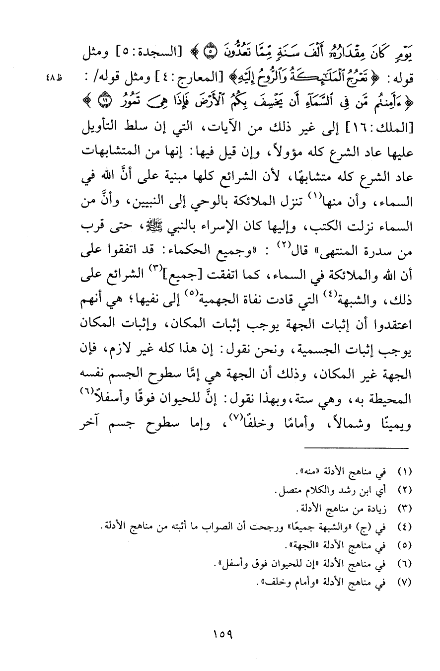 يَوْمٍ كَانَ مِقْدَارُهُ أَلْفَ سَنَةٍ مِّمَّا تَعُدُّونَ (5) } [السجدة: 5] ومثل قوله: {تَعْرُجُ الْمَلَائِكَةُ وَالرُّوحُ إِلَيْهِ} [المعارج: 4] ومثل قوله: {أَأَمِنتُم مَّن فِي السَّمَاءِ أَن يَخْسِفَ بِكُمُ الأَرْضَ فَإِذَا هِيَ تَمُورُ (16) } [الملك: 16] إلى غير ذلك من الآيات، التي إن سلط التأويل عليها عاد الشرع كله مؤولًا، وإن قيل فيها: إنها من المتشابهات عاد الشرع كله متشابهًا، لأن الشرائع كلها مبنية على أنَّ الله في السماء، وأن منها تنزل الملائكة بالوحي إلى النبيين، وأنَّ من السماء نزلت الكتب، وإليها كان الإسراء بالنبي صلى الله عليه وسلم، حتى قرب من سدرة المنتهى» قال: «وجميع الحكماء: قد اتفقوا على أن الله والملائكة في السماء، كما اتفقت [جميع] الشرائع على ذلك، والشبهة التي قادت نفاة الجهمية إلى نفيها؛ هي أنهم اعتقدوا أن إثبات الجهة يوجب إثبات المكان، وإثبات المكان يوجب إثبات الجسمية، ونحن نقول: إن هذا كله غير لازم، فإن الجهة غير المكان، وذلك أن الجهة هي إمَّا سطوح الجسم نفسه المحيطة به، وهي ستة، وبهذا نقول: إنَّ للحيوان فوقًا وأسفلًا ويمينًا وشمالًا، وأمامًا وخلفًا، وإما سطوح جسم آخر