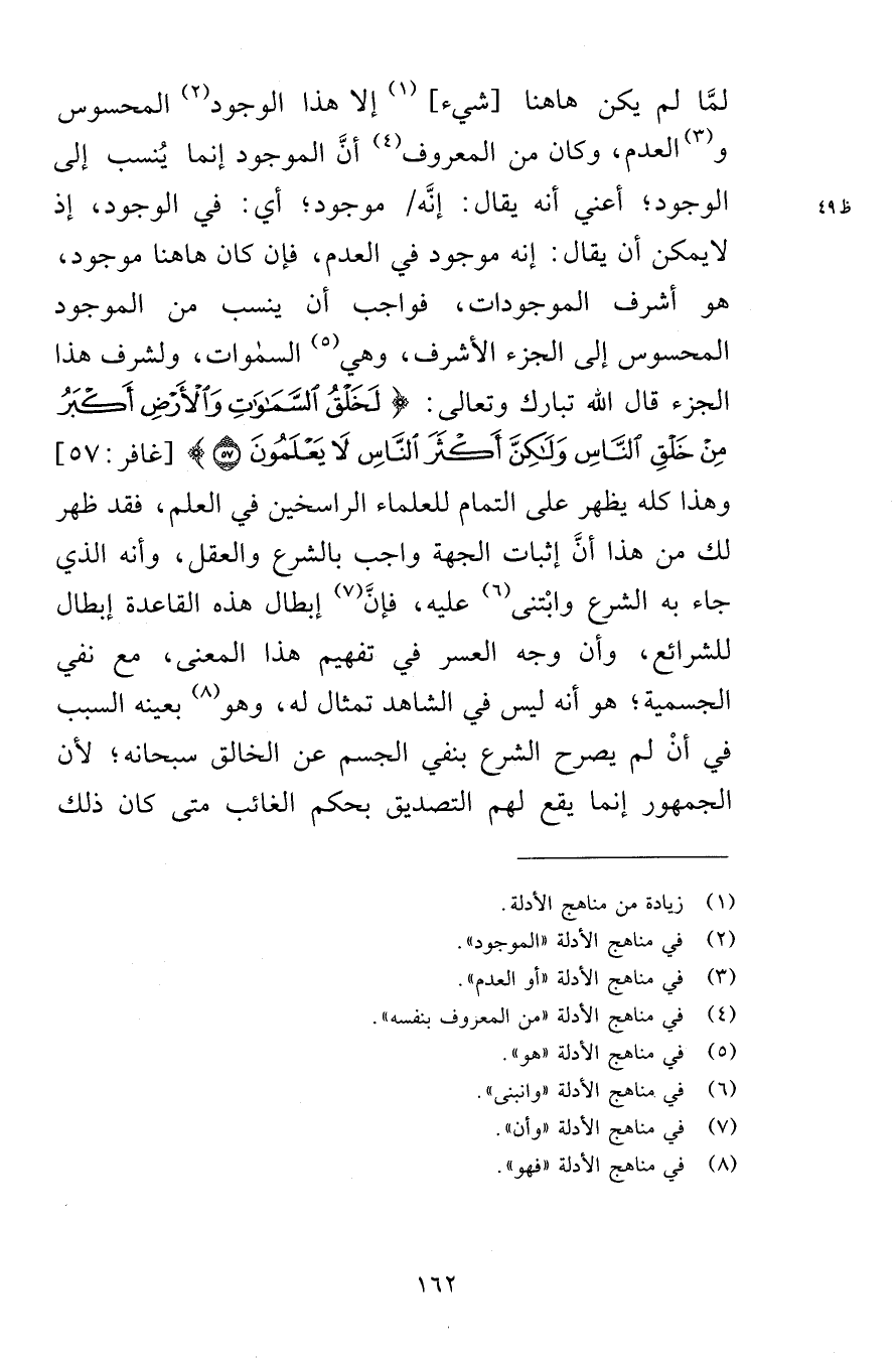 لمَّا لم يكن هاهنا [شيء] إلا هذا الوجود المحسوس والعدم، وكان من المعروف أنَّ الموجود إنما يُنسب إلى الوجود؛ أعني أنَّه يقال: إنَّه موجود؛ أي: في الوجود، إذ لا يمكن أن يقال: إنه موجود في العدم، فإن كان هاهنا موجود، هو أشرف الموجودات، فواجب أن ينسب من الموجود المحسوس إلى الجزء الأشرف، وهي السموات، ولشرف هذا الجزء قال الله تبارك وتعالى: {لَخَلْقُ السَّمَاوَاتِ وَالْأَرْضِ أَكْبَرُ مِنْ خَلْقِ النَّاسِ وَلَكِنَّ أَكْثَرَ النَّاسِ لَا يَعْلَمُونَ (57) } [غافر: 57] وهذا كله يظهر على التمام للعلماء الراسخين في العلم، فقد ظهر لك من هذا أنَّ إثبات الجهة واجب بالشرع والعقل، وأنه الذي جاء به الشرع وابْتنى عليه، فإنَّ إبطال هذه القاعدة إبطال للشرائع، وأن وجه العسر في تفهيم هذا المعنى، مع نفي الجسمية؛ هو أنه ليس في الشاهد تمثال له، وهو بعينه السبب في أنْ لم يصرح الشرع بنفي الجسم عن الخالق سبحانه؛ لأن الجمهور إنما يقع لهم التصديق بحكم الغائب متى كان ذلك