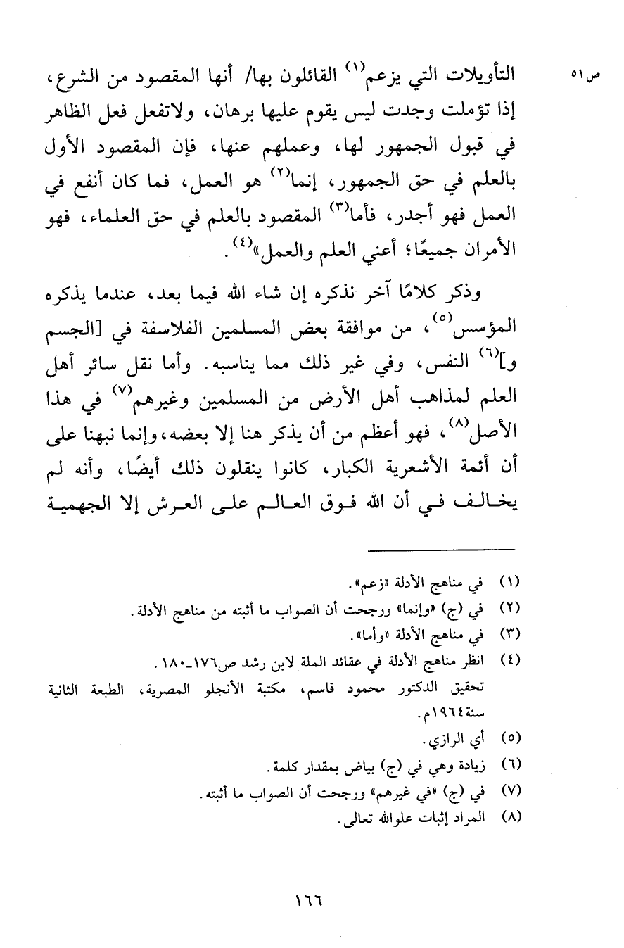 وذكر كلامًا آخر نذكره إن شاء الله فيما بعد، عندما يذكره المؤسس، من موافقة بعض المسلمين الفلاسفة في [الجسم و] النفس، وفي غير ذلك مما يناسبه. وأما نقل سائر أهل العلم لمذاهب أهل الأرض من المسلمين وغيرهم في هذا الأصل، فهو أعظم من أن يذكر هنا إلا بعضه، وإنما نبهنا على أن أئمة الأشعرية الكبار، كانوا ينقلون ذلك أيضًا، وأنه لم يخالف في أن الله فوق العالم على العرش إلا الجهمية