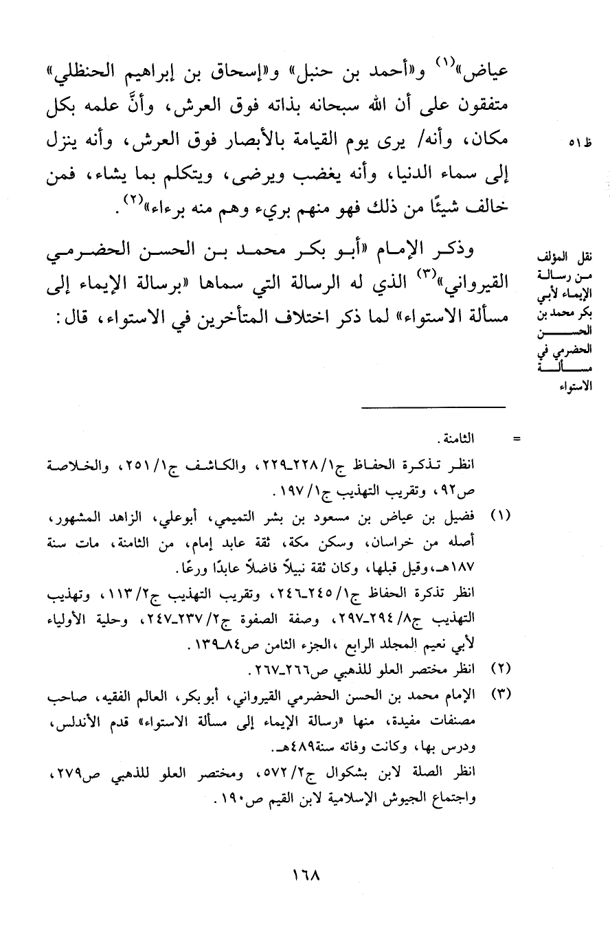 وذكر الإمام «أبو بكر محمد بن الحسن الحضرمي القيرواني» الذي له الرسالة التي سماها «برسالة الإيماء إلى مسألة الاستواء» لما ذكر اختلاف المتأخرين في الاستواء، قال: