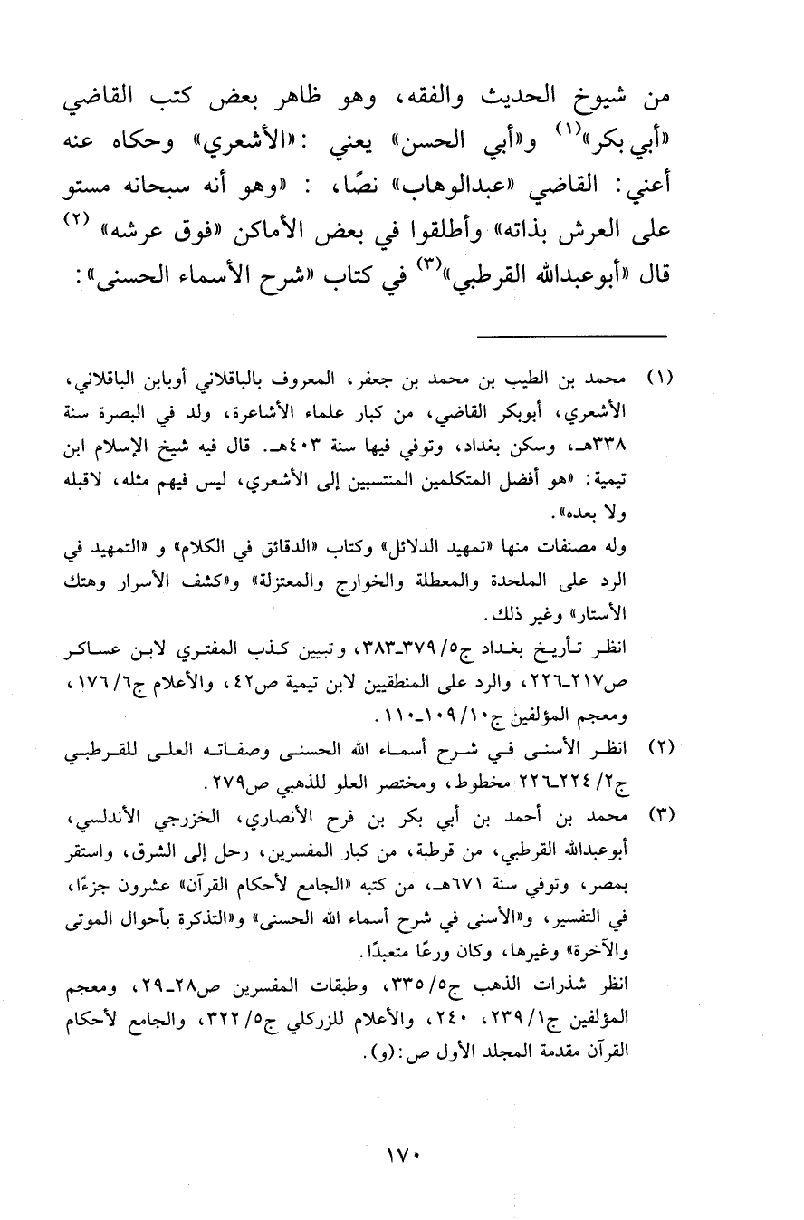 من شيوخ الحديث والفقه، وهو ظاهر بعض كتب القاضي أبي «بكر» و «أبي الحسن» يعني: «الأشعري» وحكاه عنه أعني: القاضي «عبد الوهاب» نصًا،: «وهو أنه سبحانه مستو على العرش بذاته» وأطلقوا في بعض الأماكن «فوق عرشه» قال «أبو عبد الله القرطبي» في كتاب «شرح الأسماء الحسنى» :