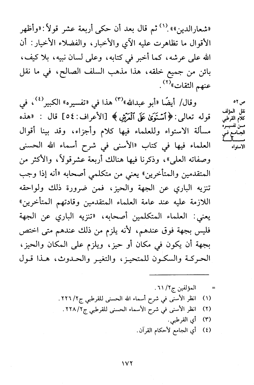 وقال أيضًا «أبو عبد الله» هذا في «تفسيره» الكبير، في قوله تعالى: {اسْتَوَى عَلَى الْعَرْشِ} [الأعراف: 54] قال: «هذه مسألة الاستواء وللعلماء فيها كلام وأجزاء، وقد بينا أقوال العلماء فيها في كتاب «الأسني في شرح أسماء الله الحسنى وصفاته العلى» ، وذكرنا فيها هنالك أربعة عشر قولًا، والأكثر من المتقدمين والمتأخرين» يعني من متكلمي أصحابه «أنه إذا وجب تنزيه الباري عن الجهة والحيز، فمن ضرورة ذلك ولواحقه اللازمة عليه عند عامة العلماء المتقدمين وقادتهم المتأخرين» يعني: العلماء المتكلمين أصحابه، «تنزيه الباري عن الجهة فليس بجهة فوق عندهم، لأنه يلزم من ذلك عندهم متى اختص بجهة أن يكون في مكان أو حيز، ويلزم على المكان والحيز، الحركة والسكون للمتحيز، والتغير والحدوث، هذا قول