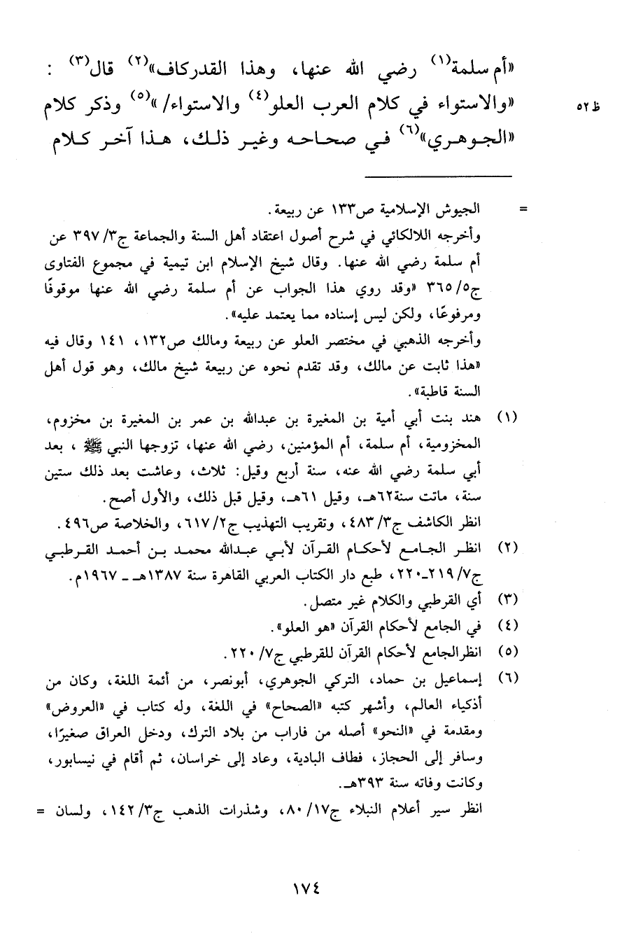 «أم سلمة» رضي الله عنها، وهذا القدر كاف» قال: «والاستواء في كلام العرب العلو والاستواء» وذكر كلام «الجوهري» في صحاحه وغير ذلك، هذا آخر كلام
