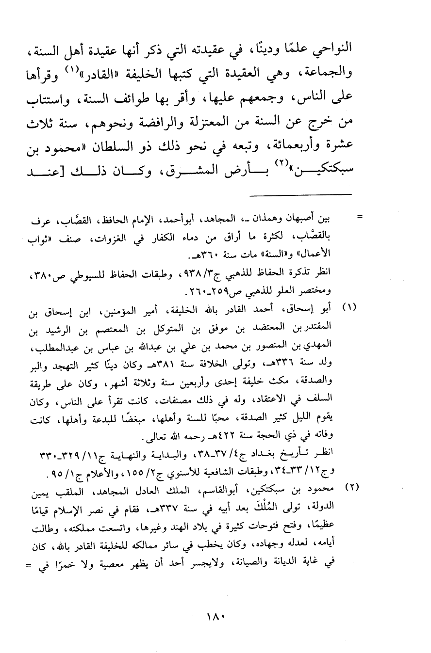 النواحي علمًا ودينًا، في عقيدته التي ذكر أنها عقيدة أهل السنة، والجماعة، وهي العقيدة التي كتبها الخليفة «القادر» وقرأها على الناس، وجمعهم عليها، واقر بها طوائف السنة، واستتاب من خرج عن السنة من المعتزلة والرافضة ونحوهم، سنة ثلاث عشرة وأربعمائة، وتبعه في نحو ذلك ذو السلطان «محمود بن سبكتكين» بأرض المشرق، وكان ذلك [عند