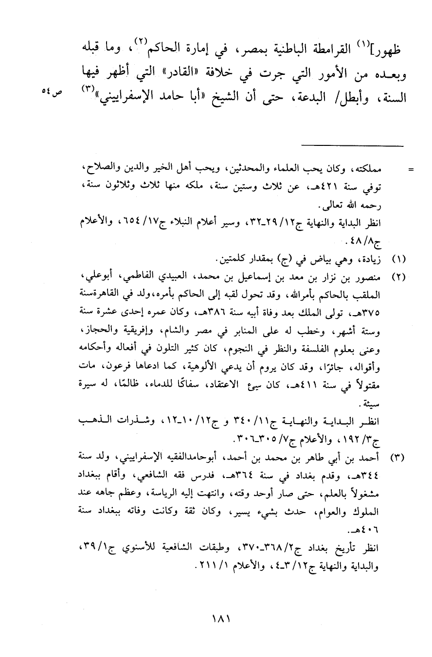 ظهور] القرامطة الباطنية بمصر، في إمارة الحاكم، وما قبله وبعده من الأمور التي جرت في خلافة «القادر» التي أظهر فيها السنة، وأبطل البدعة، حتى أن الشيخ «أبا حامد الإسفراييني»