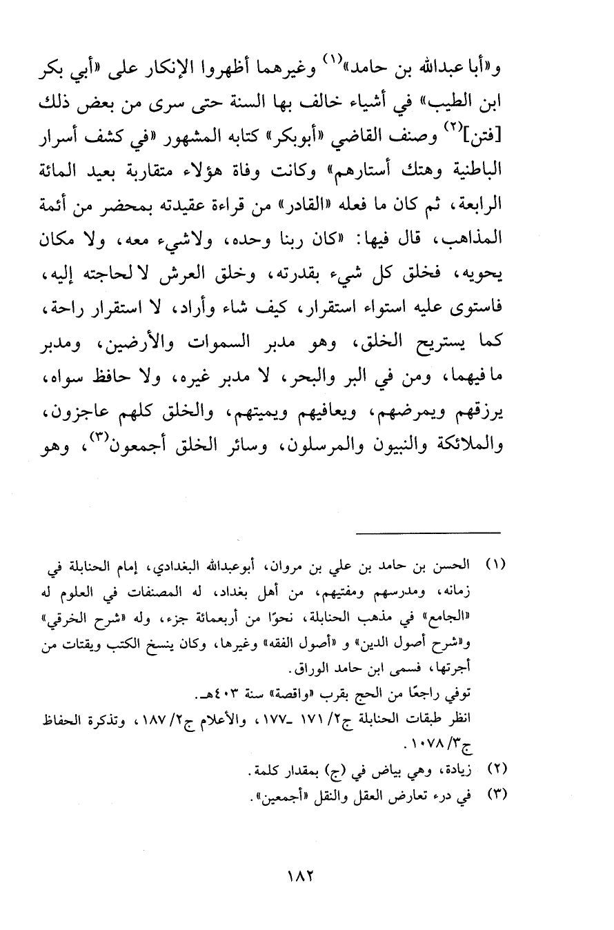و «أبا عبد الله بن حامد» وغيرهما أظهروا الإنكار على «أبي بكر بن الطيب» في أشياء خالف بها السنة حتى سرى من بعض ذلك [فتن] وصنف القاضي «أبو بكر» كتابه المشهور «في كشف أسرار الباطنية وهتك أستارهم» وكانت وفاة هؤلاء متقاربة بعيد المائة الرابعة، ثم كان ما فعله «القادر» من قراءة عقيدته بمحضر من أئمة المذاهب، قال فيها: «كان ربنا وحده، ولا شيء معه، ولا مكان يحويه، فخلق كل شيء بقدرته، وخلق العرش لا لحاجته إليه، فاستوى عليه استواء استقرار، كيف شاء وأراد، لا استقرار راحة، كما يستريح الخلق، وهو مدبر السموات والأرضين، ومدبر ما فيهما، ومن في البر والبحر، لا مدبر غيره، ولا حافظ سواه، يرزقهم ويمرضهم، ويعافيهم ويميتهم، والخلق كلهم عاجزون، والملائكة والنبيون والمرسلون، وسائر الخلق أجمعون، وهو