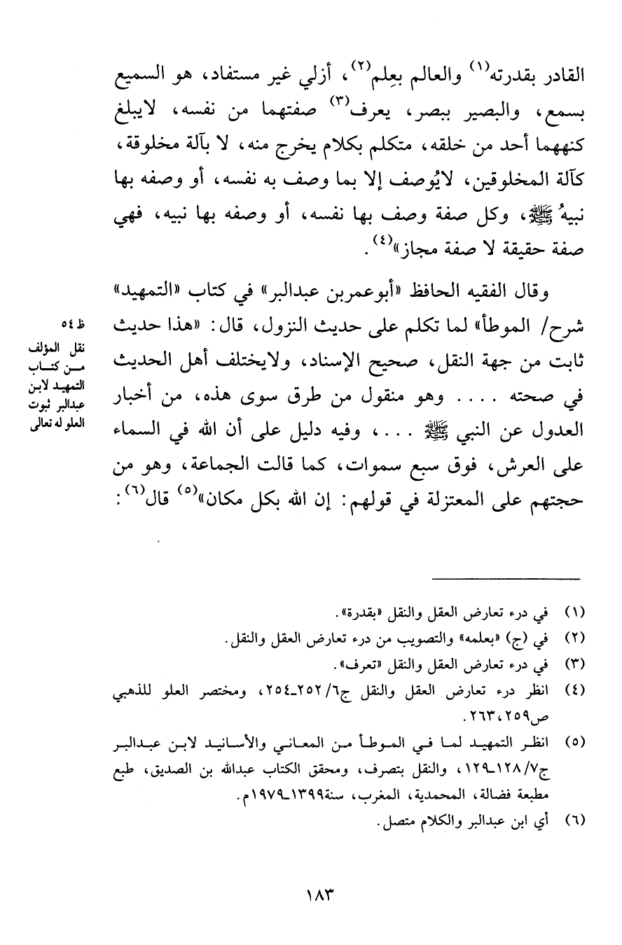 وقال الفقيه الحافظ «أبو عمر بن عبد البر» في كتاب «التمهيد شرح الموطأ» لما تكلم على حديث النزول، قال: «هذا حديث ثابت من جهة النقل، صحيح الإسناد، ولا يختلف أهل الحديث في صحته ... وهو منقول من طرق سوى هذه، من أخبار العدول عن النبي صلى الله عليه وسلم ... ، وفيه دليل على أن الله في السماء على العرش، فوق سبع سموات، كما قالت الجماعة، وهو من حجتهم على المعتزلة في قولهم: إن الله بكل مكان» قال: