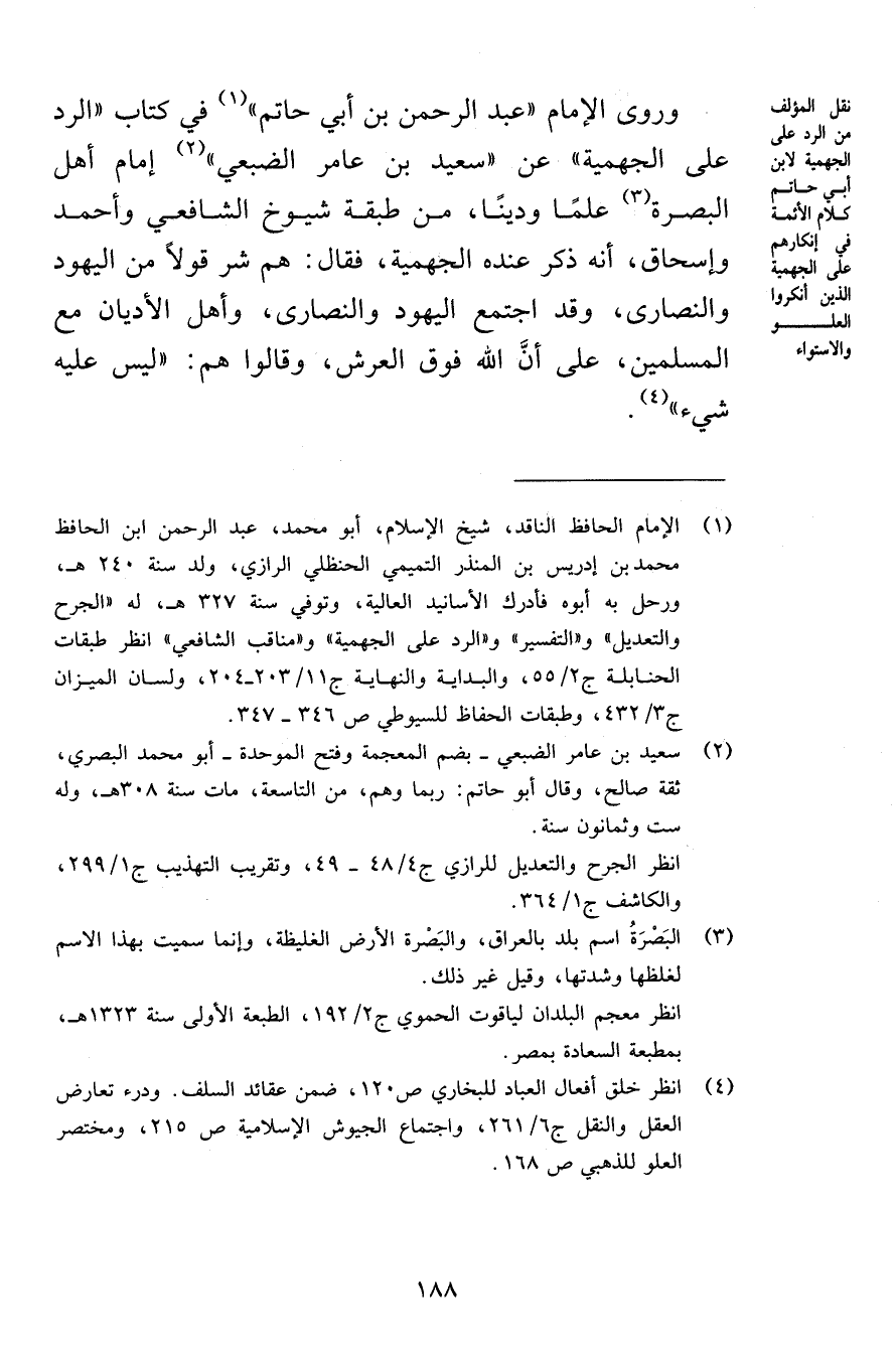 وروى الإمام «عبد الرحمن بن أبي حاتم» في كتاب «الرد على الجهمية» عن «سعيد بن عامر الضبعي» إمام أهل البصرة علمًا ودينًا، من طبقة شيوخ الشافعي وأحمد وإسحاق، أنه ذكر عنده الجهمية، فقال هم شر قولًا من اليهود والنصارى، وقد اجتمع اليهود والنصارى، وأهل الأديان مع المسلمين، على أنَّ الله فوق العرش، وقالوا هم: «ليس عليه شيء» .
