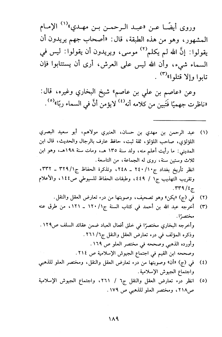 وروى أيضًا عن «عبد الرحمن بن مهدي» الإمام المشهور، وهو من هذه الطبقة، قال: «أصحاب جهم يريدون أن يقولوا: إنَّ الله لم يكلم موسى، ويريدون أن يقولوا: ليس في السماء شيء، وأن الله ليس على العرش، أرى أن يستتابوا فإن تابوا وإلا قتلوا» .