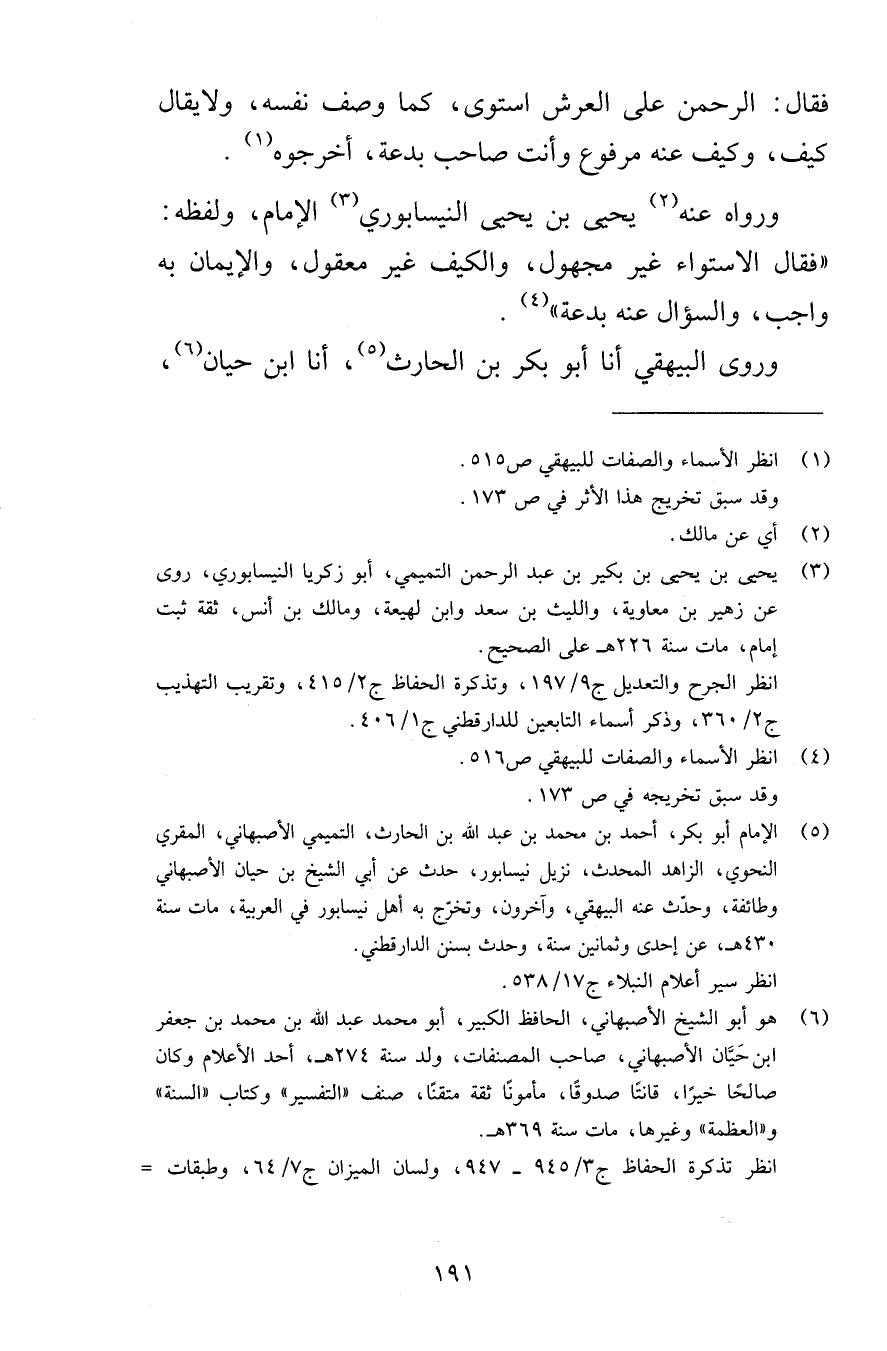 ورواه عنه يحيى بن يحيى النيسابوري الإمام، ولفظه: «فقال الاستواء غير مجهول، والكيف غير معقول، والإيمان به واجب، والسؤال عنه بدعة» .