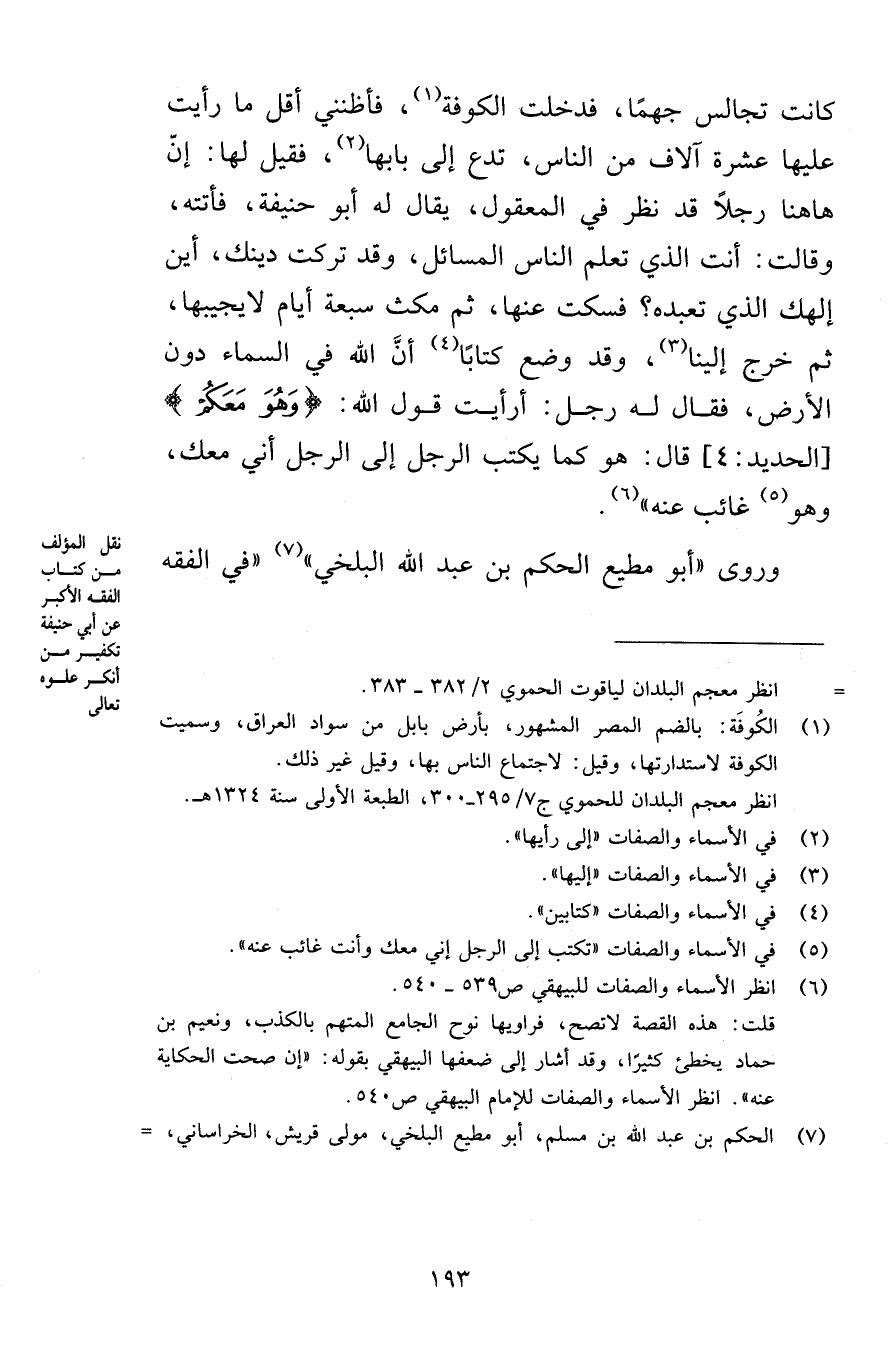 كانت تجالس جهمًا، فدخلت الكوفة، فأظنني أقل ما رأيت عليها عشرة آلاف من الناس، تدع إلى بابها، فقيل لها: إنّ هاهنا رجلًا قد نظر في المعقول، يقال له أبو حنيفة، فأتته، وقالت: أنت الذي تعلم الناس المسائل، وقد تركت دينك، أين إلهك الذي تعبده؟ فسكت عنها، ثم مكث سبعة أيام لا يجيبها، ثم خرج إلينا، وقد وضع كتابًا أنَّ الله في السماء دون الأرض، فقال له رجل: أرأيت قول الله: {وَهُوَ مَعَكُمْ} [الحديد: 4] قال: هو كما يكتب الرجل إلى الرجل أني معك، وهو غائب عنه» .