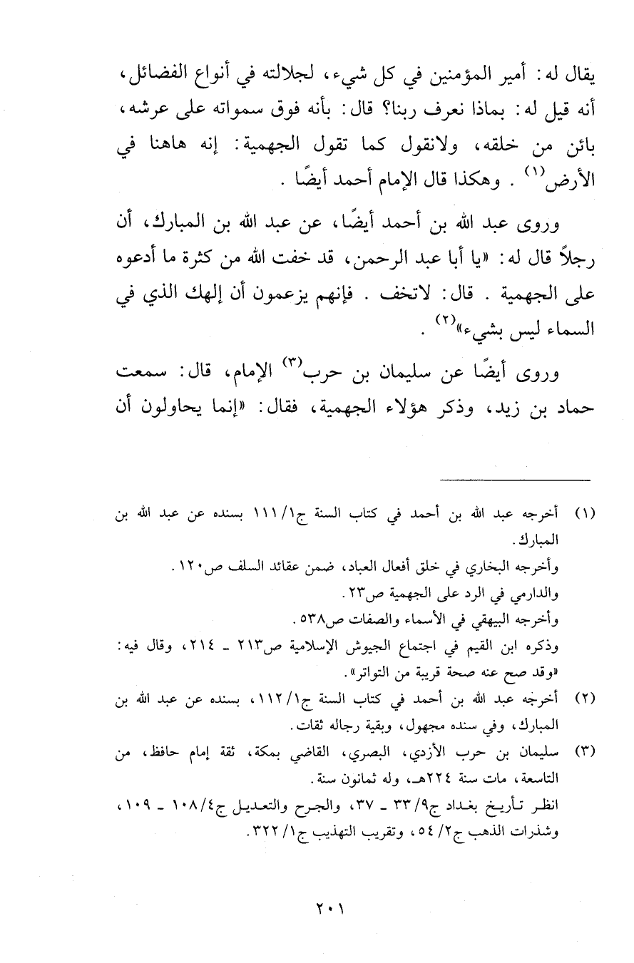 وروى عبد الله بن أحمد أيضًا، عن عبد الله بن المبارك، أن رجلًا قال له: «يا أبا عبد الرحمن، قد خفت الله من كثرة ما أدعوه على الجهمية. قال: لا تخف. فإنهم يزعمون أن إلهك الذي في السماء ليس بشيء» .
