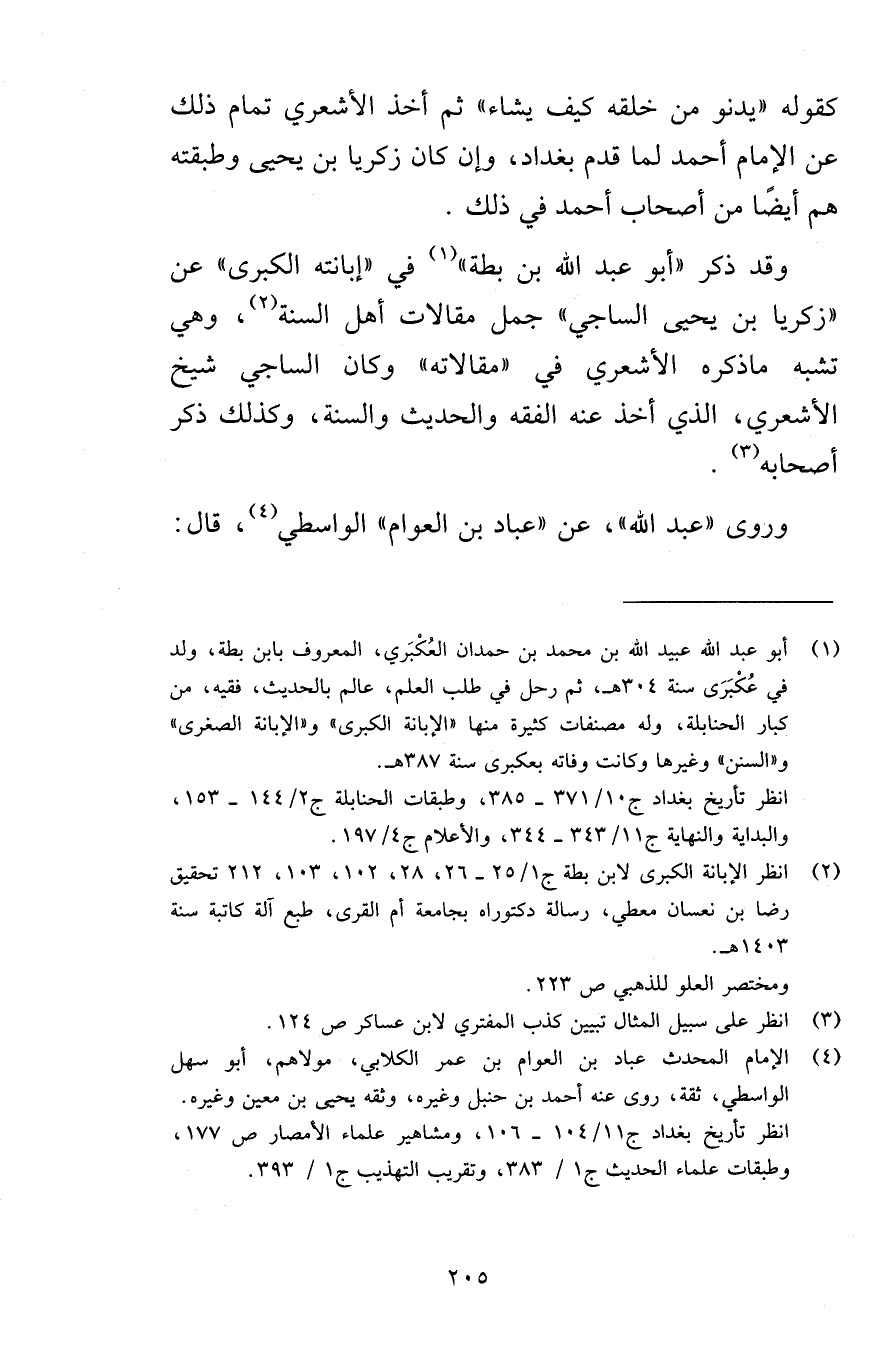 كقوله «يدنو من خلقه كيف يشاء» ثم أخذ الأشعري تمام ذلك عن الإمام أحمد لما قدم بغداد، وإن كان زكريا بن يحيى وطبقته هم أيضًا من أصحاب أحمد في ذلك.