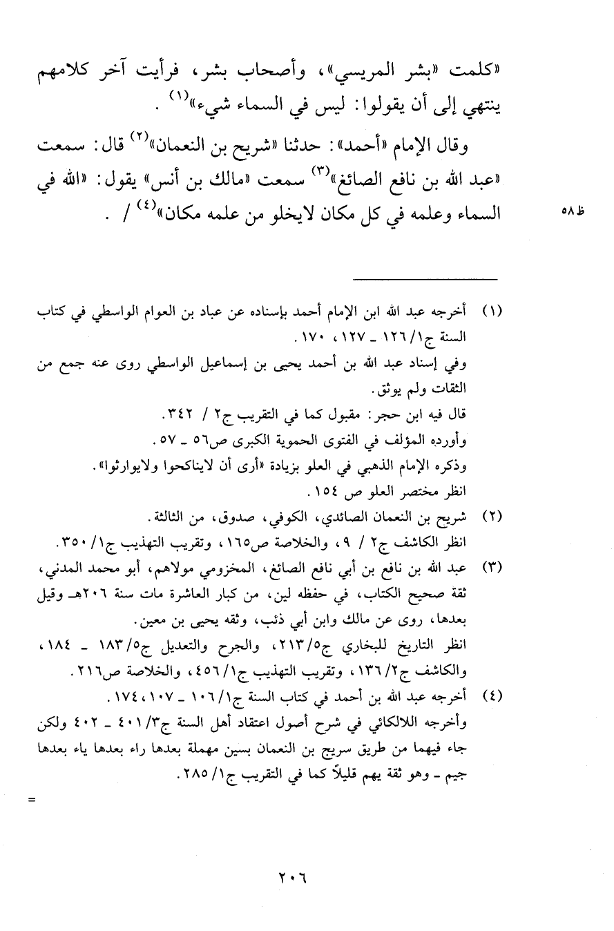 وقال الإمام «أحمد» : حدثنا «شريح بن النعمان» قال: سمعت «عبد الله بن نافع الصائغ» سمعت «مالك بن أنس» يقول: «الله في السماء وعلمه في كل مكان لا يخلو من علمه مكان» .