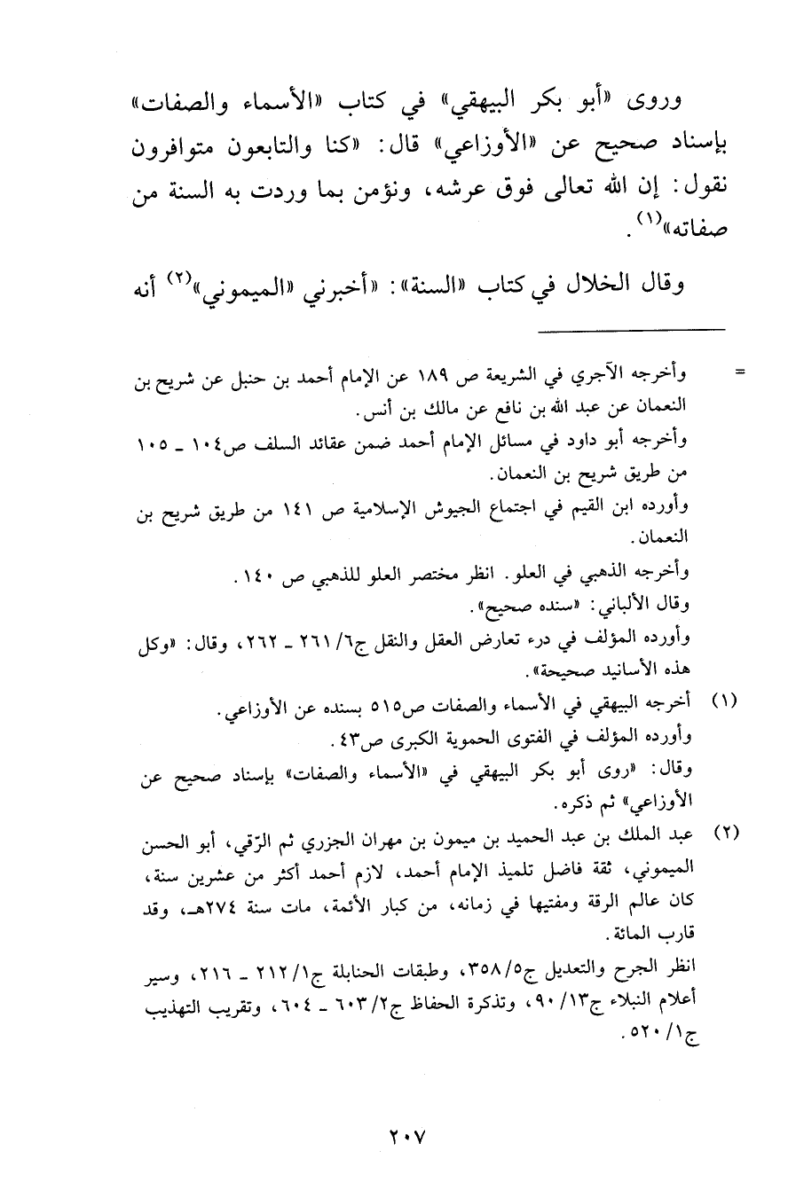 وروى «أبو بكر البيهقي» في كتاب «الأسماء والصفات» بإسناد صحيح عن «الأوزاعي» قال: «كنا والتابعون متوافرون نقول: إن الله تعالى فوق عرشه، ونؤمن بما وردت به السنة من صفاته» .