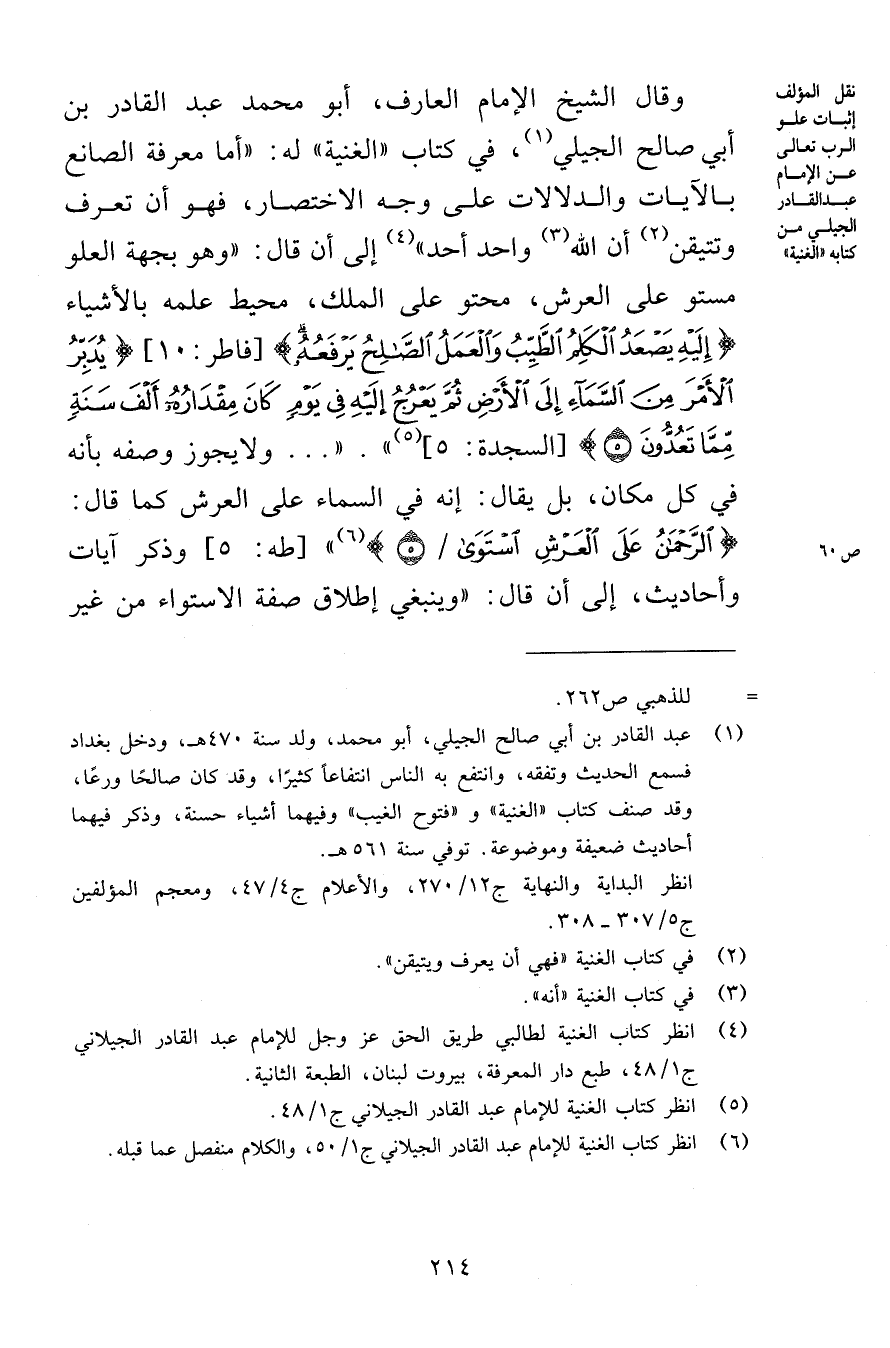 وقال الشيخ الإمام العارف، أبو محمد عبد القادر بن أبي صالح الجيلي، في كتاب «الغنية» له: «أما معرفة الصانع بالآيات والدلالات على وجه الاختصار، فهو أن تعرف وتتيقن أن الله واحد أحد» إلى أن قال: «وهو بجهة العلو مستو على العرش، محتو على الملك، محيط علمه بالأشياء {إِلَيْهِ يَصْعَدُ الْكَلِمُ الطَّيِّبُ وَالْعَمَلُ الصَّالِحُ يَرْفَعُهُ} [فاطر: 10] {يُدَبِّرُ الْأَمْرَ مِنَ السَّمَاءِ إِلَى الْأَرْضِ ثُمَّ يَعْرُجُ إِلَيْهِ فِي يَوْمٍ كَانَ مِقْدَارُهُ أَلْفَ سَنَةٍ مِّمَّا تَعُدُّونَ (5) } [السجدة: 5] . « ... ولا يجوز وصفه بأنه في كل مكان، بل يقال: إنه في السماء على العرش كما قال: {الرَّحْمَنُ عَلَى الْعَرْشِ اسْتَوَى (5) } [طه: 5] وذكر آيات وأحاديث، إلى أن قال: «وينبغي إطلاق صفة الاستواء من غير