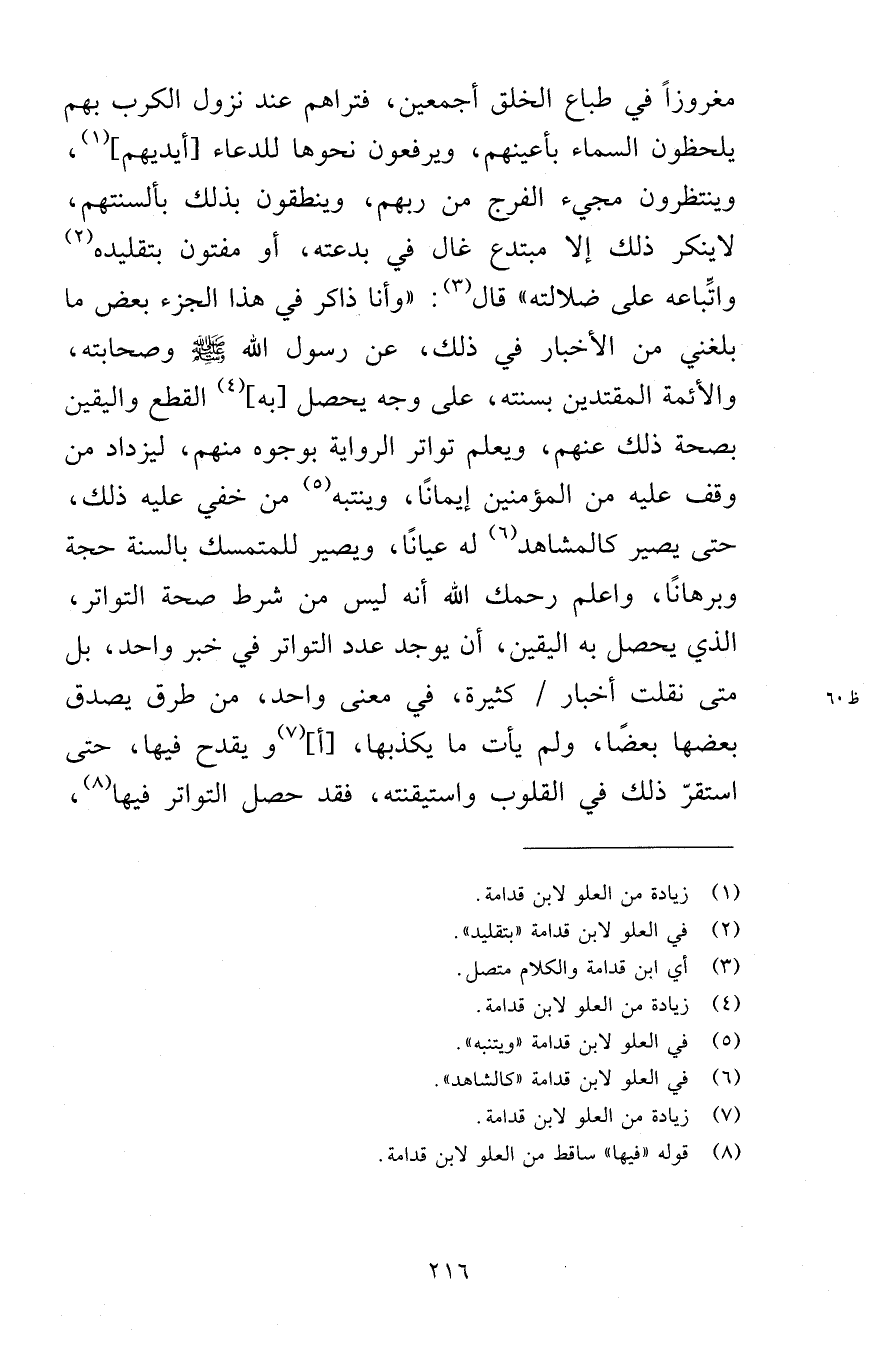 مغروزًا في طباع الخلق أجمعين، فتراهم عند نزول الكرب بهم يلحظون السماء بأعينهم، ويرفعون نحوها للدعاء [أيديهم] ، وينتظرون مجيء الفرج من ربهم، وينطقون ذلك بألسنتهم، لاينكر ذلك إلا مبتدع غال في بدعته، أو مفتون بتقليده واتِّباعه على ضلالته» قال: «وأنا ذاكر في هذا الجزء بعض ما بلغني من الأخبار في ذلك، عن رسول الله صلى الله عليه وسلم وصحابته، والأئمة المقتدين بسنته، على وجه يحصل [به] القطع واليقين بصحة ذلك عنهم، ويعلم تواتر الرواية بوجوه منهم، ليزداد من وقف عليه من المؤمنين إيمانًا، وينتبه من خفي عليه ذلك، حتى يصير كالمشاهد له عيانًا، ويصير للمتمسك بالسنة حجة وبرهانًا، واعلم رحمك الله أنه ليس من شرط صحة التواتر، الذي يحصل به اليقين، أن يوجد عدد التواتر في خبر واحد، بل متى نقلت أخبار كثيرة، في معنى واحد، من طرق يصدق بعضها بعضًا، ولم يأت ما يكذبها، [أ] ويقدح فيها، حتى استقرّ ذلك في القلوب واستيقنته، فقد حصل التواتر فيها،