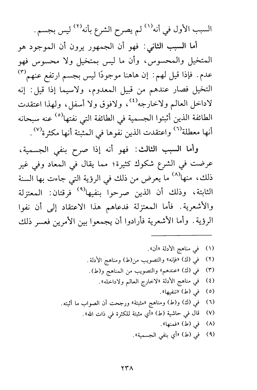وأما السبب الثالث: فهو أنه إذا صرح بنفي الجسمية، عرضت في الشرع شكوك كثيرة؛ مما يقال في المعاد وفي غير ذلك، منها ما يعرض من ذلك في الرؤية التي جاءت بها السنة الثابتة، وذلك أن الذين صرحوا بنفيها فرقتان: المعتزلة والأشعرية. فأما المعتزلة فدعاهم هذا الاعتقاد إلى أن نفوا الرؤية. وأما الأشعرية فأرادوا أن يجمعوا بين الأمرين فعسر ذلك