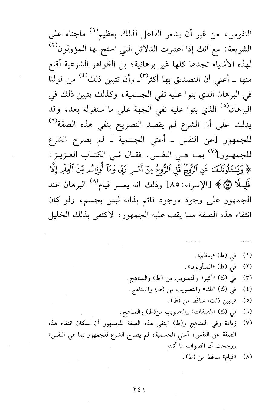 النفوس، من غير أن يشعر الفاعل لذلك بعظيم ما جناه على الشريعة: مع أنك إذا اعتبرت الدلائل التي احتج بها المؤولون لهذه الأشياء تجدها كلها غير برهانية؛ بل الظواهر الشرعية أقنع منها -أعني أن التصديق بها أكثر- وأن تتبين ذلك من قولنا في البرهان الذي بنوا عليه نفي الجسمية، وكذلك يتبين ذلك في البرهان الذي بنوا عليه نفي الجهة على ما سنقوله بعد، وقد يدلك على أن الشرع لم يقصد التصريح بنفي هذه الصفة للجمهور [عن النفس -أعني الجسمية- لم يصرح الشرع للجمهور] بما هي النفس. فقال في الكتاب العزيز: {وَيَسْأَلُونَكَ عَنِ الرُّوحِ قُلِ الرُّوحُ مِنْ أَمْرِ رَبِّي وَمَا أُوتِيتُم مِّنَ الْعِلْمِ إِلَّا قَلِيلًا (85) } [الإسراء: 85] وذلك أنه يعسر قيام البرهان عند الجمهور على وجود موجود قائم بذاته ليس بجسم، ولو كان انتفاء هذه الصفة مما يقف عليه الجمهور، لاكتفى بذلك الخليل
