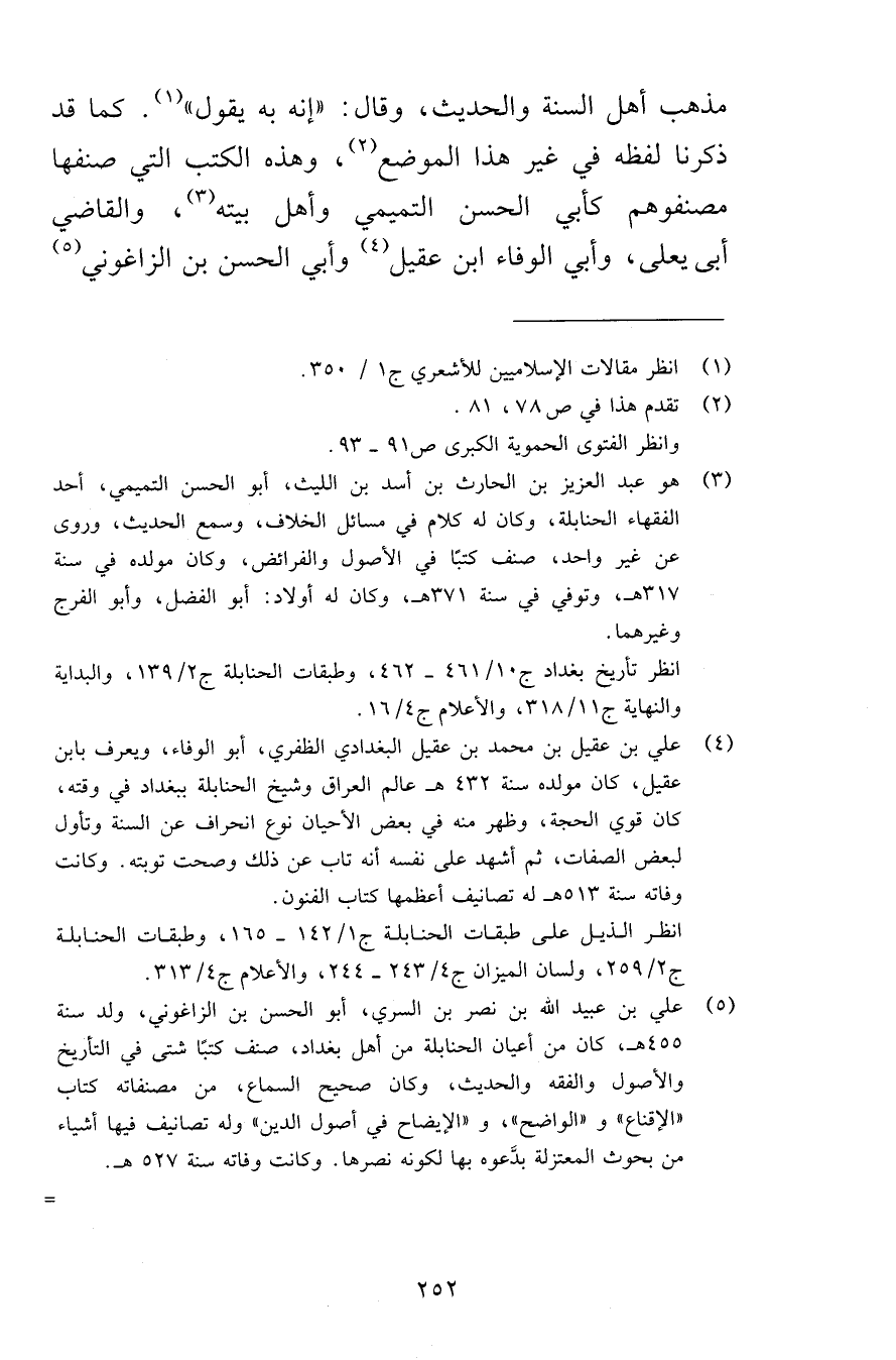 مذهب أهل السنة والحديث، وقال: «إنه به يقول» . كما قد ذكرنا لفظه في غير هذا الموضع، وهذه الكتب التي صنفها مصنفوهم كأبي الحسن التميمي وأهل بيته، والقاضي أبي يعلى، وأبي الوفاء ابن عقيل وأبي الحسن بن الزاغوني