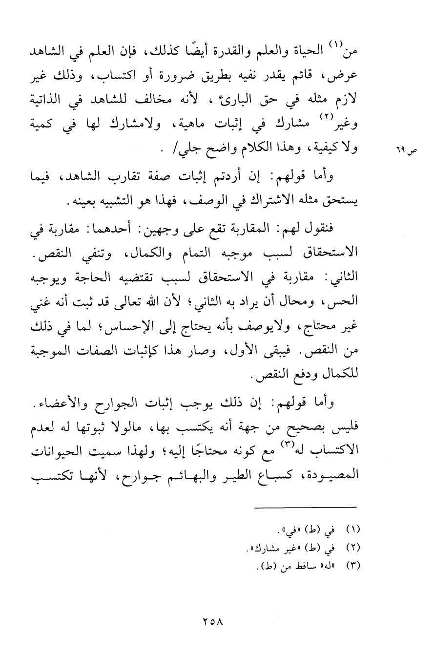 من الحياة والعلم والقدرة أيضًا كذلك، فإن العلم في الشاهد عرض، قائم يقدر نفيه بطريق ضرورة أو اكتساب، وذلك غير لازم مثله في حق البارئ، لأنه مخالف للشاهد في الذاتية وغير مشارك في إثبات ماهية، ولا مشارك لها في كمية ولا كيفية، وهذا الكلام واضح جلي.