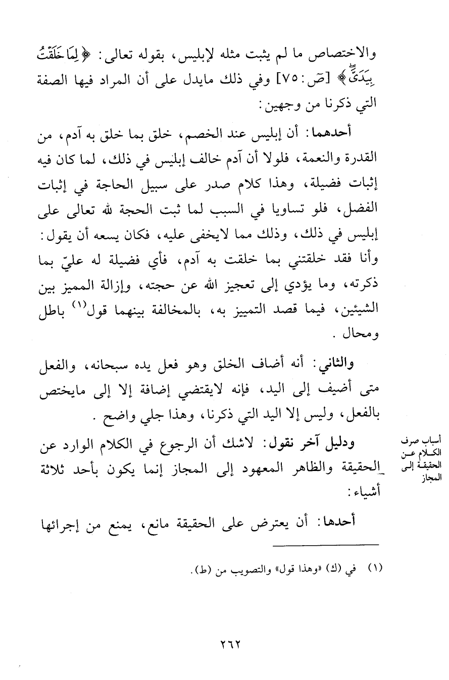 والاختصاص ما لم يثبت مثله لإبليس، بقوله تعالى: {لِمَا خَلَقْتُ بِيَدَيَّ} [ص: 75] وفي ذلك ما يدل على أن المراد فيها الصفة التي ذكرنا من وجهين: